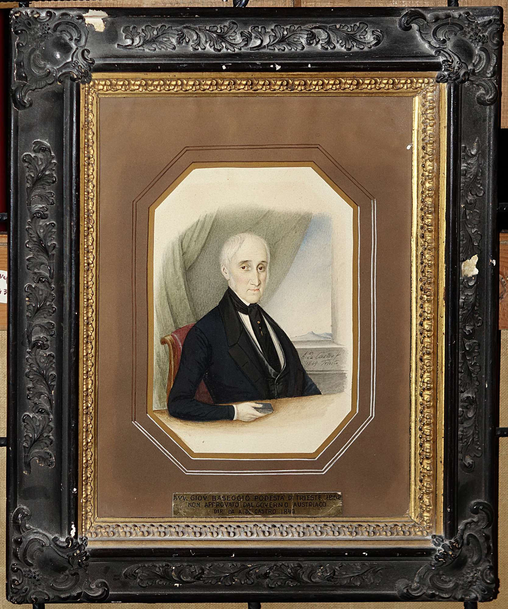Il ritratto, firmato Andrea de Castro e datato 1849, raffigura l’avvocato Giovanni Baseggio, che nel 1852 fu nominato Podestà di Trieste, senza l’approvazione dal Governo Austriaco.