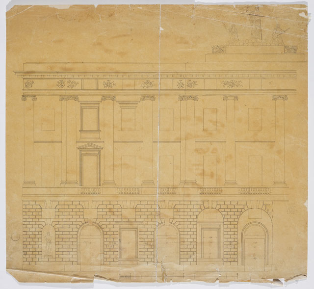 Secondo Pavan, il disegno, che rappresenta la metà sinistra del prospetto principale del Teatro Verdi in scala 1:50, può essere attribuito all'ing. Eugenio Geringer, che fin dal 1882 si era occupato di un restauro dell'edificio. "L'identica modellazione dei capitelli ionici, la corrispondenza delle misure con la facciata verso il mare [...] fanno pensare che il rilievo sia stato utilizzato per la progettazione di quel prospetto e quindi eseguito con questo preciso scopo" (Pavan 1988, pp. 80-81). Nel disegno è tratteggiata anche la decorazione scultorea dell'edificio: l'Apollo citaredo affiancato da due muse, le metope con strumenti musicali e la scultura di Plutone nella nicchia del basamento a sinistra.