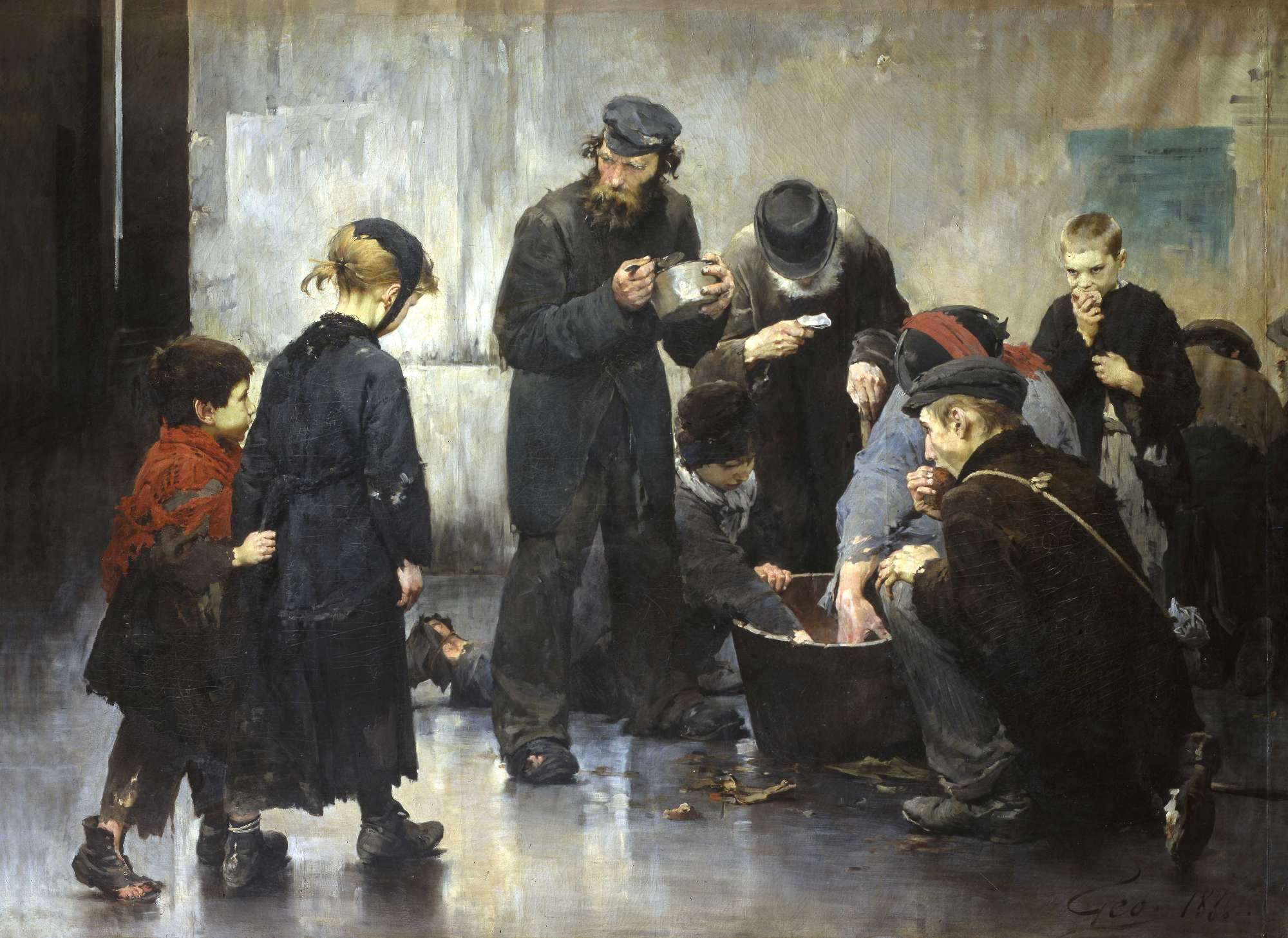 Come per il quadro di Evariste Carpentier posseduto da questo museo, anche il dipinto di Geoffroy fu notato dal pittore Giovanni Rota durante la sua visita al Salon parigino dell'86 e segnalato ad Alfredo Tominz giudicandolo degno di essere acquistato "specialmente per il sentimento, per la verità e per la fattura artistica" e perchè presentava un soggetto d'attualità con "ragazzi piccoli e grandi, fanciulli (...) vittime della miseria che si sfamano in una corte dinanzi ad una grande pentola dove qualche persona caritatevole viene così in loro soccorso" (dalla lettera di Giovanni Rota ad Alfredo Tominz del 10 maggio 1886). Il Rota si adoperò molto per l'acquisto, come stanno a testimoniare le numerose lettere conservate presso l'archivio amministrativo, inviando fotografie, notizie relative all'autore, riferendo dei colloqui avuti direttamente con il Geoffroy; dimostrandosi alfine soddisfatto della decisione del Curatorio, ma quindi deluso perchè in un articolo dell'Indipendente, non compariva il suo nome ma quello di Leon Bonnat in qualità di consigliere del Curatorio per l'acquisto. Il nome di Bonnat, compare tuttavia in una lettera (non datata) inviata da Parigi dal barone Giuseppe Morpurgo, allora presidente del Curatorio del museo, da cui si deduce che Morpurgo si reca insieme a Rota a visitare il Salon per valutare direttamente i dipinti di Geoffroy e di Carpentier, su cui aveva avuto un parere favorevole anche da parte del Bonnat. In effetti le cronache del tempo diedero risalto all'acquisto di questo quadro, e nell'articolo citato si sottolineava lo "slancio di talento" e la "potenza di verismo" del Geoffroy, si riferiva della menzione del giurì che aveva giudicato l'opera degna della medaglia d'oro, e di un articolo apparso su "Le monde poetique", dove si descriveva il soggetto in maniera più esatta e cruda rispetto quanto aveva fatto il Rota: "Les affamés sono gente che alle porte delle caserme vanno a cercare nei mastelli gli avanzi del rancio, tutto il rifiuto che i cani medesimi disdegnano, e quei derelitti divorano come bestie voraci. Ogni sentimento di umanità sparisce in quegli esseri; il bisogno, la fame, questa lente tortura aguzza soltanto gli istinti di un appetito bestiale. Guardate quei vecchi mendicanti. Quali sguardi d'odio e d'invidia gettano su quei due fanciulli che non ardiscono avvicinarsi; guardate come essi difendono quelle immondizie che il lungo digiuno fa loro sembrare un pasto da contendersi. Geoffroy non aveva ancora trattato personaggi di questa grandezza; e mai non era riuscito come ora a descrivere con più rigorosa intensità i drammi della strada sempre toccanti nella loro orrida brutalità". Il dipinto aveva quindi ottenuto la medaglia di II classe al Salon. Giovanni Rota donerà nel 1901 al museo un pastello del Geoffroy, Studio di bambino.