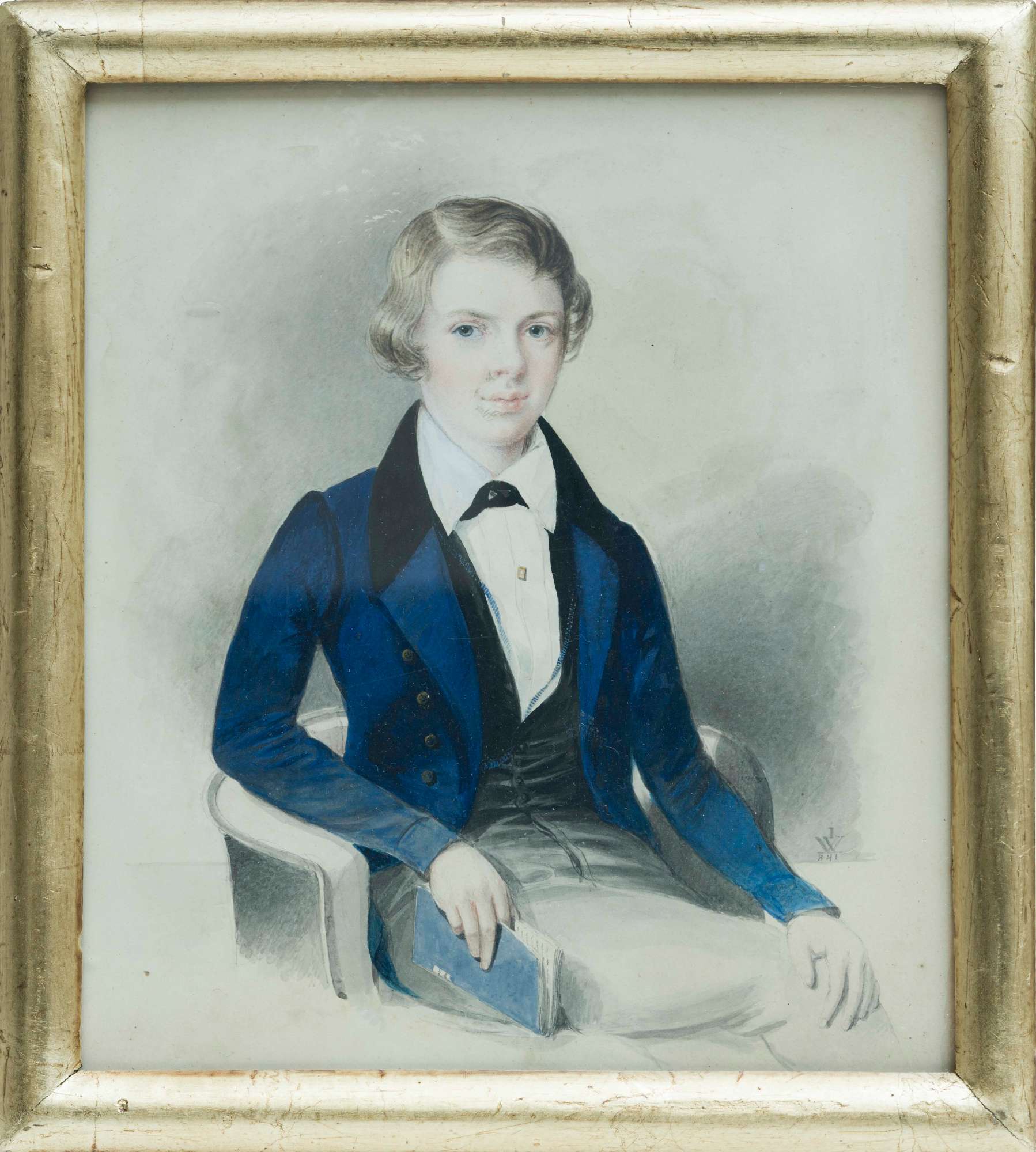 Ritratto a matita ed acquerello; raffigura un giovane uomo seduto con un libro nella destra.