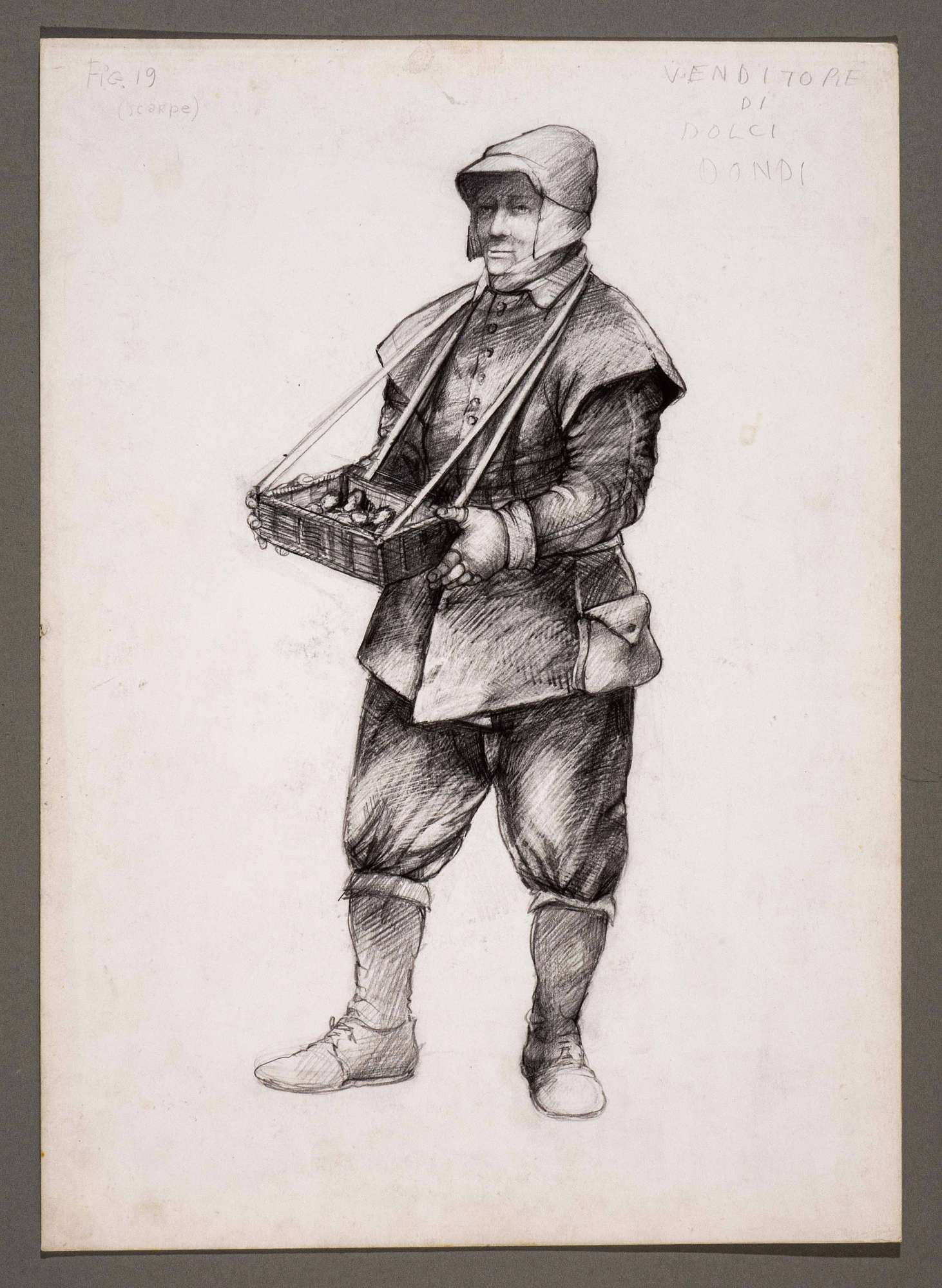 Il gioco dei potenti, libero adattamento di Giorgio Strehler da Enrico VI, dramma storico di William Shakespeare, in 15 atti e 2 giornate. Figura maschile in piedi, di tre quarti verso sinistra. Indossa un copricapo a cappuccio con frontino e paraorecchie, una giubba con spalle spioventi, guanti senza dita, brache al ginocchio, calze grosse. Porta una borsa legata al suo fianco destro e, sul davanti, un cestino rettangolare con dolciumi appeso al collo da una doppia cinghia