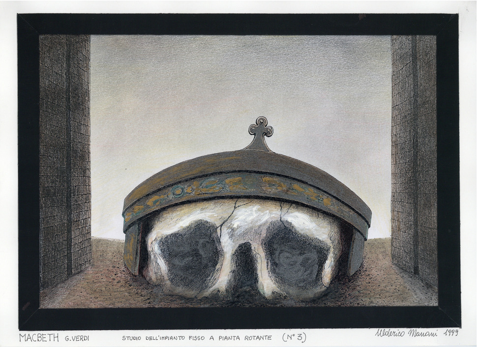 Macbeth, opera lirica di Giuseppe Verdi. Imponente impianto scenico a pavimento, in pendenza verso il fondo del palcoscenico a forma di corona con punta centrale decorata a trifoglio, occupa tutto lo spazio scenico e rivela la parte superiore di un teschio su cui la corona poggia e la cui parte inferiore affonda nel palcoscenico. Ai lati due alte mura con fessura centrale per il paesaggio. Luce bianca/ grigia