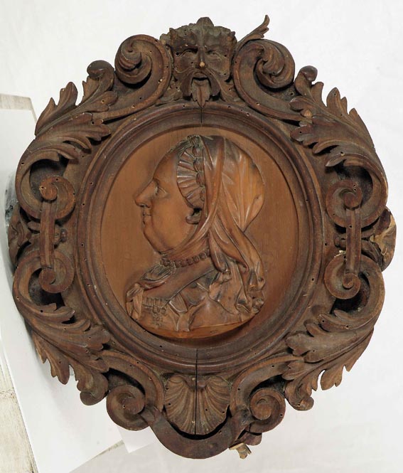 Dai verbali della seduta del Curatorio del 20 ottobre 1876 si apprende della volontà di accettare «l’offerta fatta dall’Intagliatore Moscotto il quale versa nella miseria, d’un intaglio in bosso del ritratto di Maria Teresa contornato di una cornice in noce che il suddetto lascerebbe per soli 50f». Giovanni Moscotto era una figura nota e apprezzata per le sue capacità professionali a Trieste, avendo già eseguito l’intaglio in legno per la biblioteca di Palazzo Revoltella e precedentemente alcuni bassorilievi allegorici per l’Hôtel de la Ville, oltre a una statua monumentale di Maria Teresa per l’omonimo piroscafo. Il lungo regno della sovrana portò alla realizzazione nel corso degli anni di un’ampia iconografia a lei dedicata come documentano i ritratti giovanili, i quadri di famiglia e i ritratti ufficiali fino a quella di Imperatrice vedova. A questa iconografia, diffusa tramite le monete degli anni 1765-1770 e che più si stabilizza nei territori italiani sotto controllo austriaco, si può ricondurre anche l’opera in questione per la scelta della posa di profilo dell’effigiata, ritratta in età matura e con il simbolico velo vedovile. Ma «nella medaglistica triestina l’ideale “familiare” domina costantemente sia negli esemplari del tempo come nelle opere più recenti o recentissime insieme a quello di “domestica Madre”, “Mater et Magistra”; avvolgente e protettrice del popolo e della città che si protende ai suoi piedi, addita il porto da lei avviato a più ricca vitalità e vita» (Ruaro Loseri 1980, pp. 28-29).