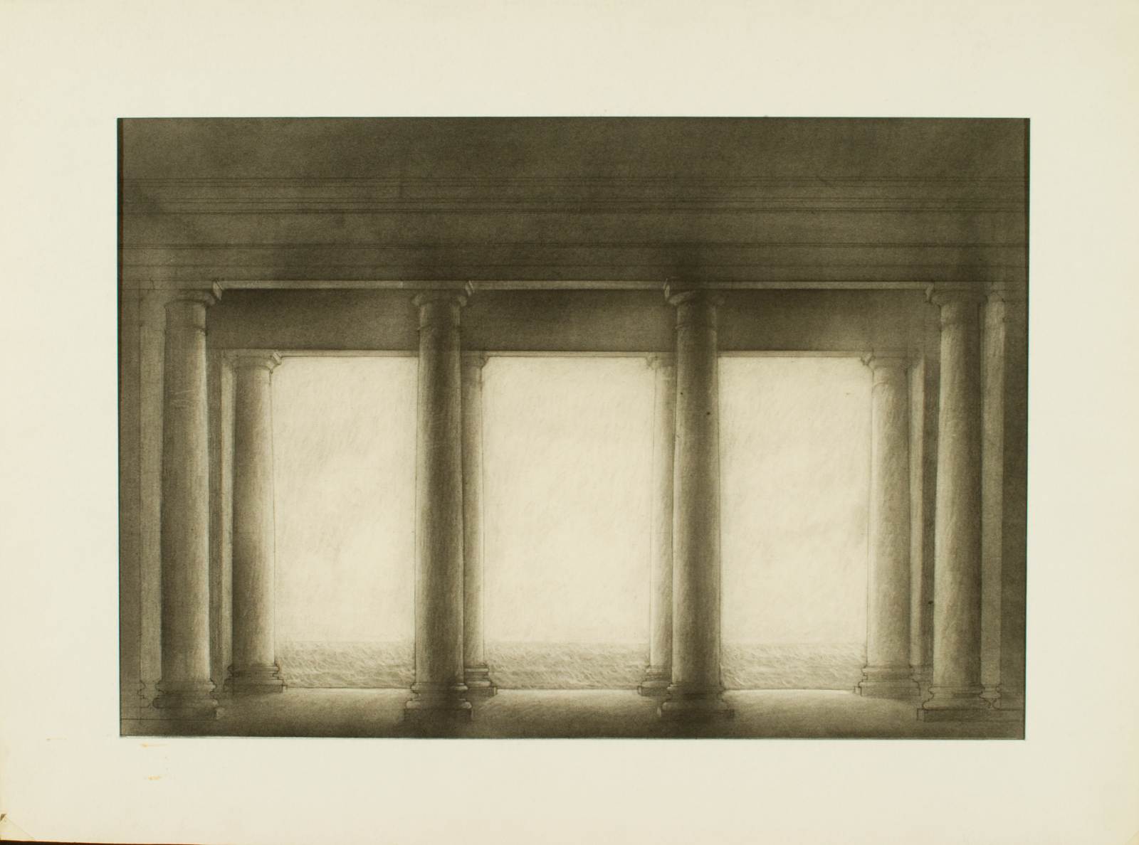 Otello, opera di Giuseppe Verdi, atto 2., castello. Interno con sala con 8 colonne di ordine toscano e trabeazione