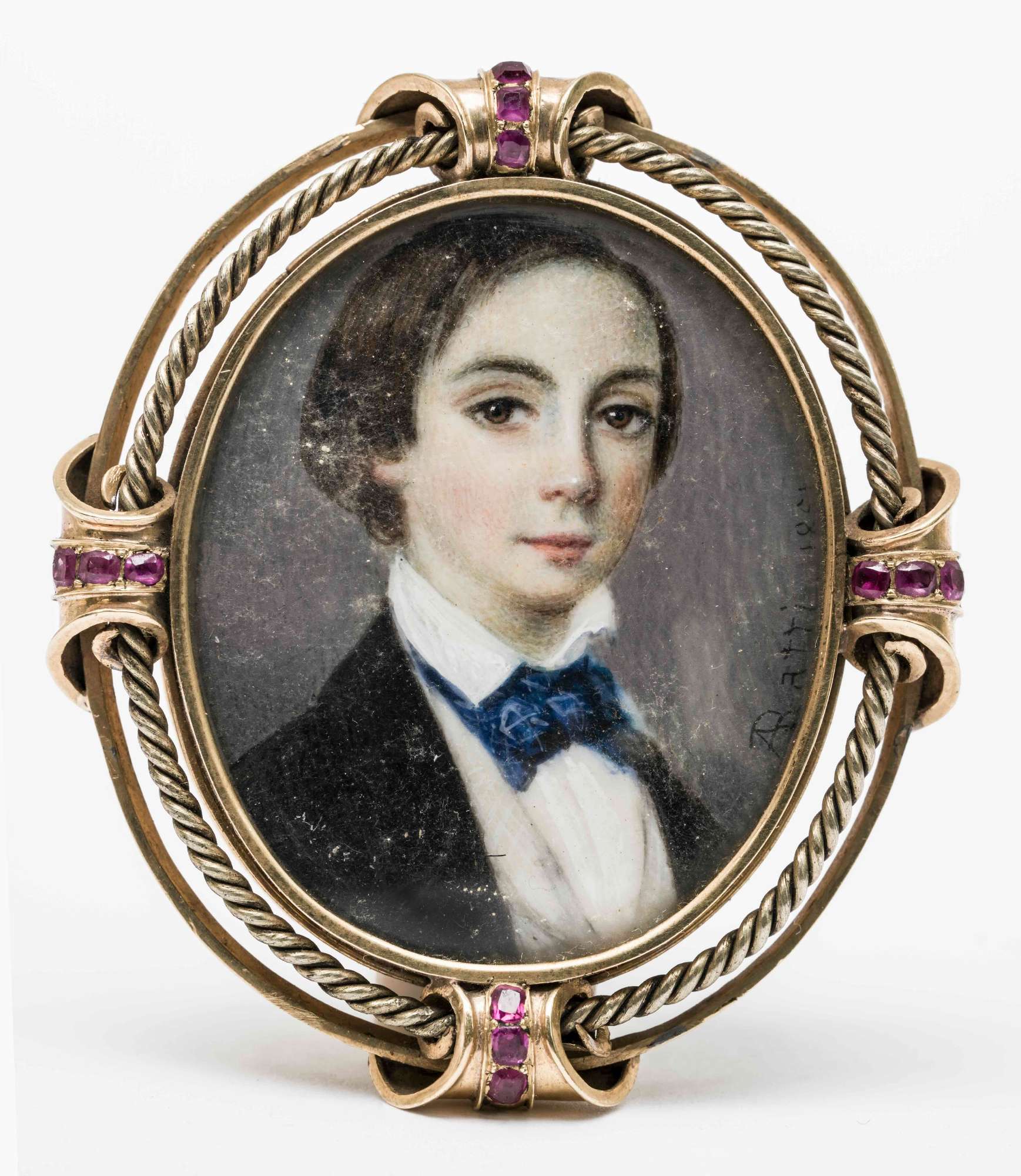 Spilla in oro, contornata da dodici rubini, racchiudente un ritratto maschile in miniatura dipinto su un ovale di madreperla.