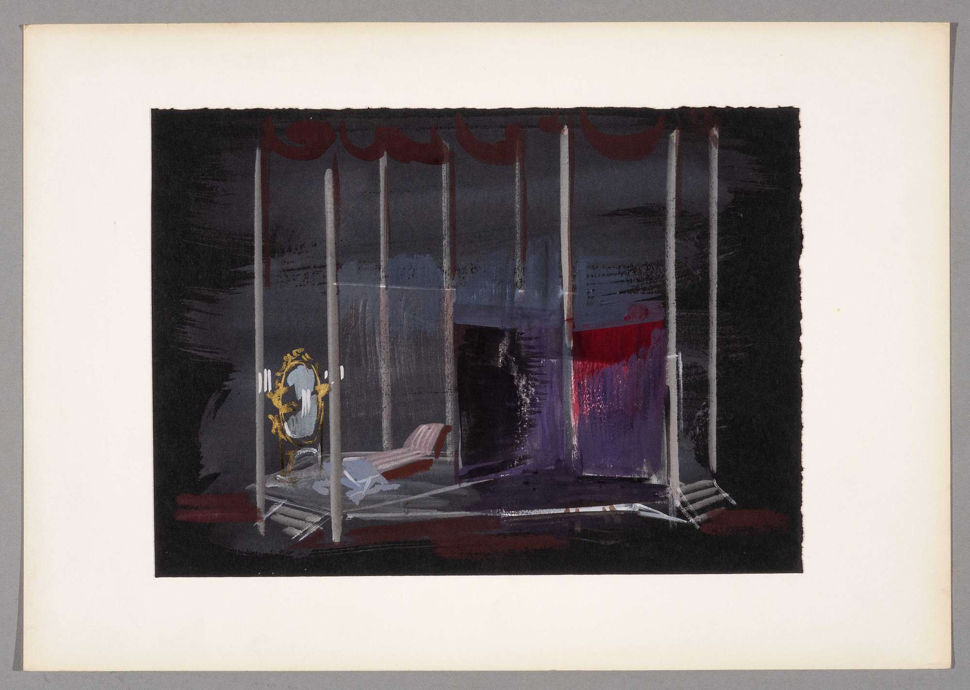 La morte di Danton, dramma di George Büchner. Interno camera, pedana praticabile raggiungibile con breve scala tanto da destra quanto da sinistra. Complementi d'arredo: chaise-longue, specchio ovale con importante cornice dorata e candelabri ai lati, a destra paravento a due teli sulle tinte del nero, viola, porpora