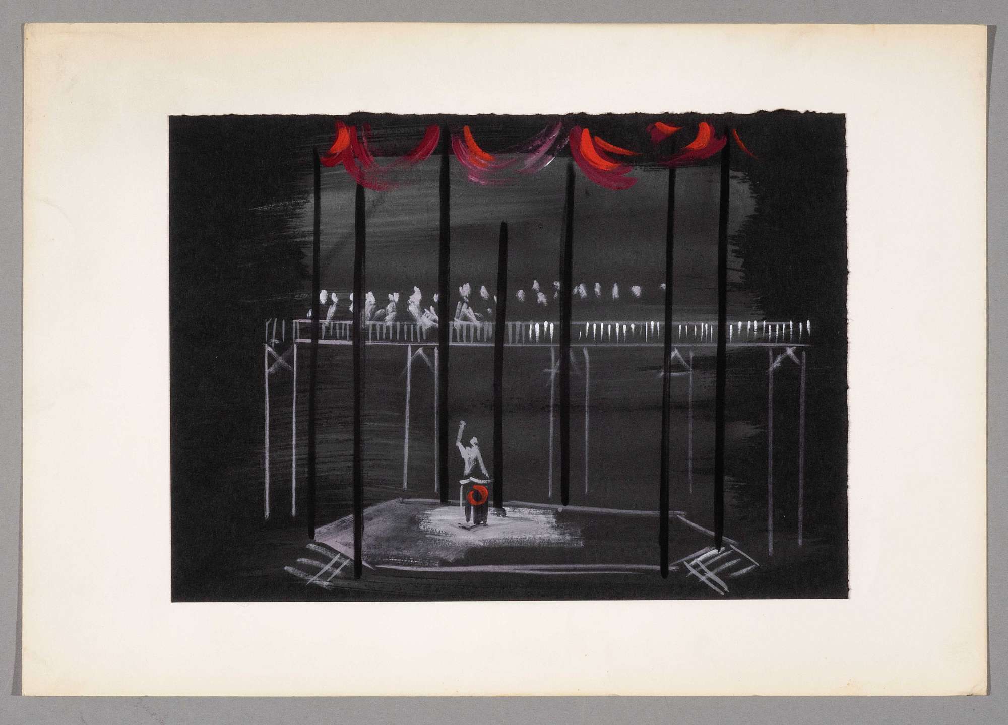La morte di Danton, dramma di George Büchner. Struttura costruita di una serie di pali alti e di una pedana praticabile, raggiungibile con pochi scalini tanto da destra quanto da sinistra. Trai pali in alto è costruita una passerella con balaustra, che ospita numerose figure umane, tratteggiate in maniera molto stilizzata. Sulla pedana una figura umana che suona apparentemente un tamburo. Luce livida dall'alto.