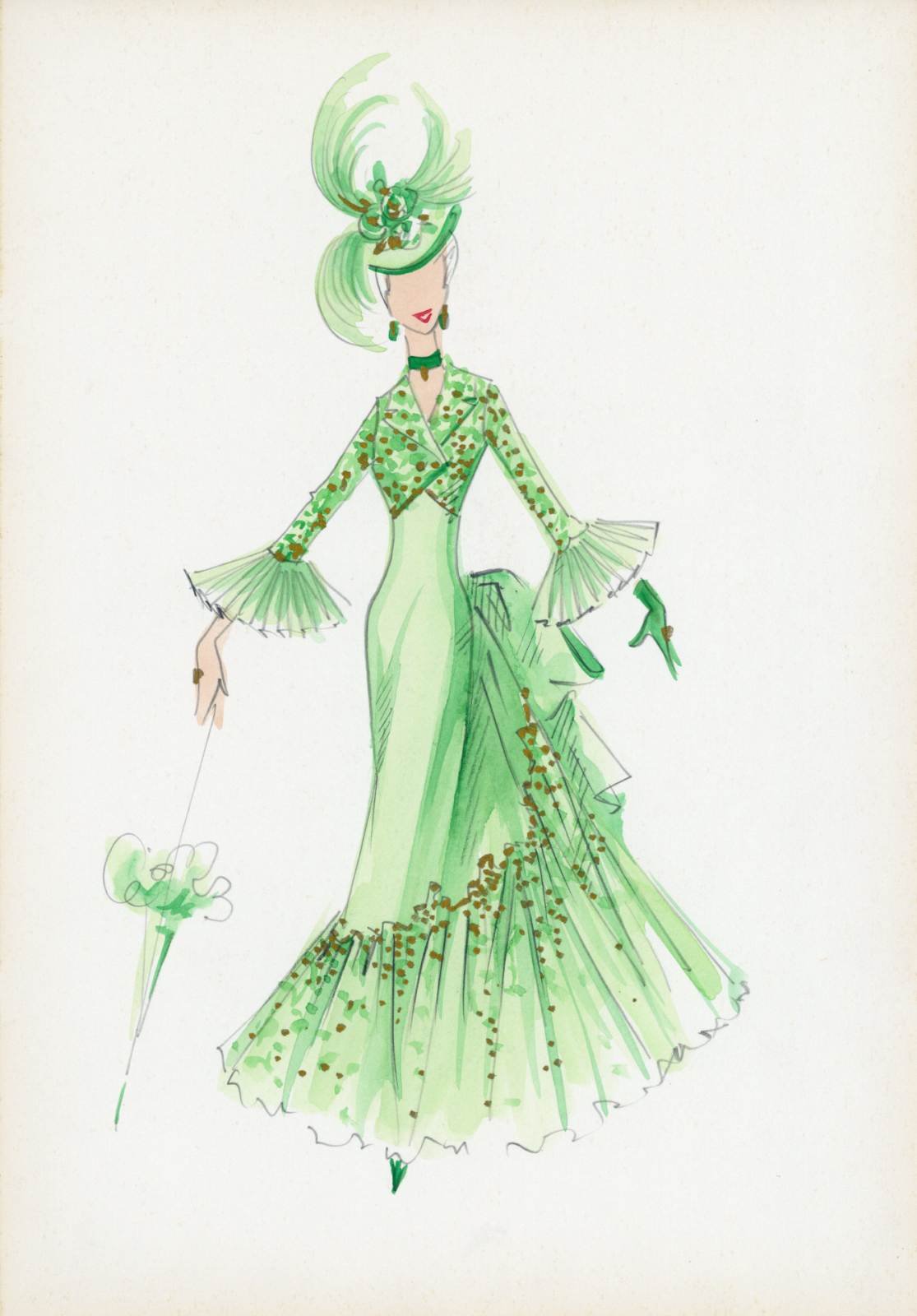 La donna perduta, operetta di Giuseppe Pietri, figura femminile in abito da passeggio con lunga gonna a campana verde, giacchino in tessuto operato, grande fiocco sul retro, accessori: cappellino fiorato con piume, ombrellino, guati, gioielli