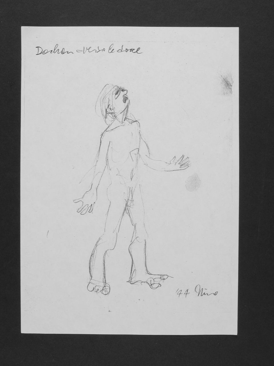 Il disegno rappresenta una persona nuda, che avanza con le braccia allargate, il volto verso l'alto, resa con pochi tratti di matita che danno l'idea della tragicità del momento.