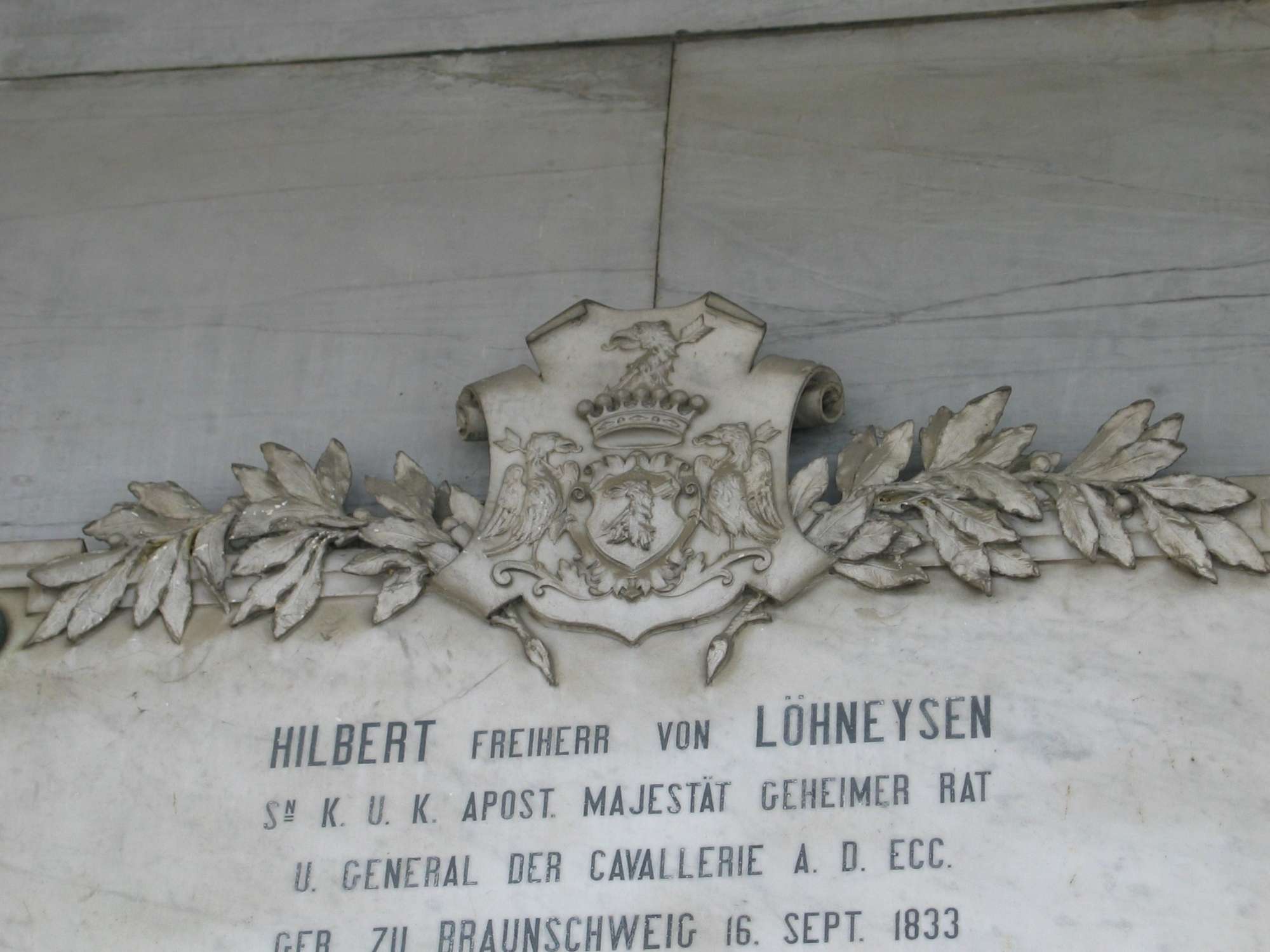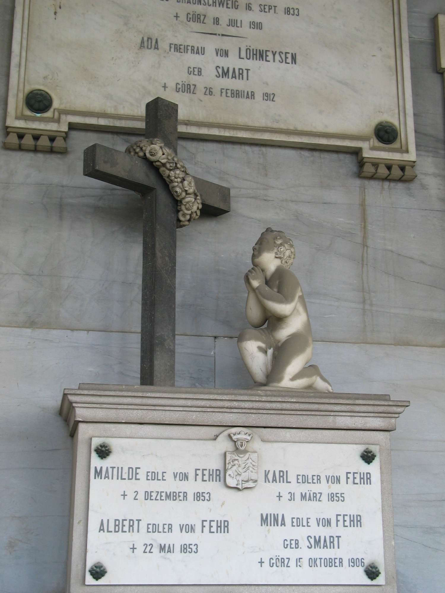 Un sarcofago di ridotte dimensioni è collocato sopra una mensola sulla parete di fondo; su di esso un puttino in preghiera è inginocchiato ai piedi di una croce ornata da una corona di fiori. Attorno al sarcofago tre grandi lapidi con iscritti i nomi dei defunti.