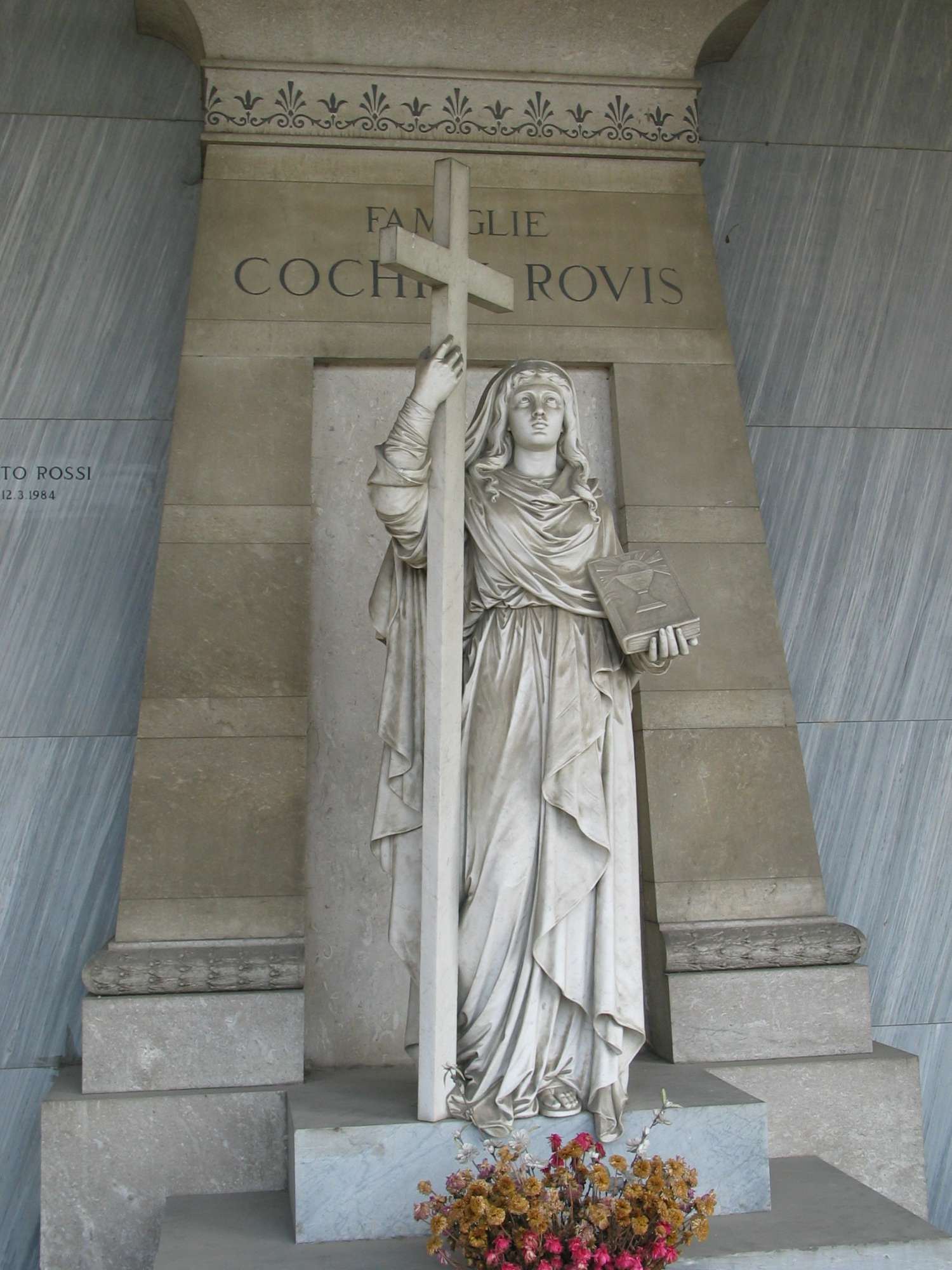 Sopra i gradini che portano all'ingresso del sepolcro è collocata la maestosa figura della Fede, che sorregge con la mano destra un'alta croce, mentre nella sinistra tiene un libro chiuso con la raffigurazione del calice eucaristico sulla copertina.