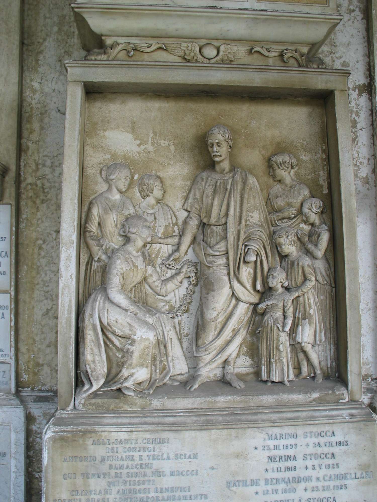 Sulla lapide, a rilievo, il gruppo di famiglia con otto personaggi: Antonio Dubbane, togato e scalzo, nell'atto di raccogliere una corona di fiori offertagli dalla moglie Tecla; attorno i figli giovinetti che pregano o si disperano per la morte dei genitori. Sopra il rilievo è collocato un sarcofago sormontato da una croce e la cui base è decorata dal globo alato e da tralci vegetali. sopra il coronamento trapezoidale è collocato l'occhio divino entro triangolo e circondato da una raggiera.