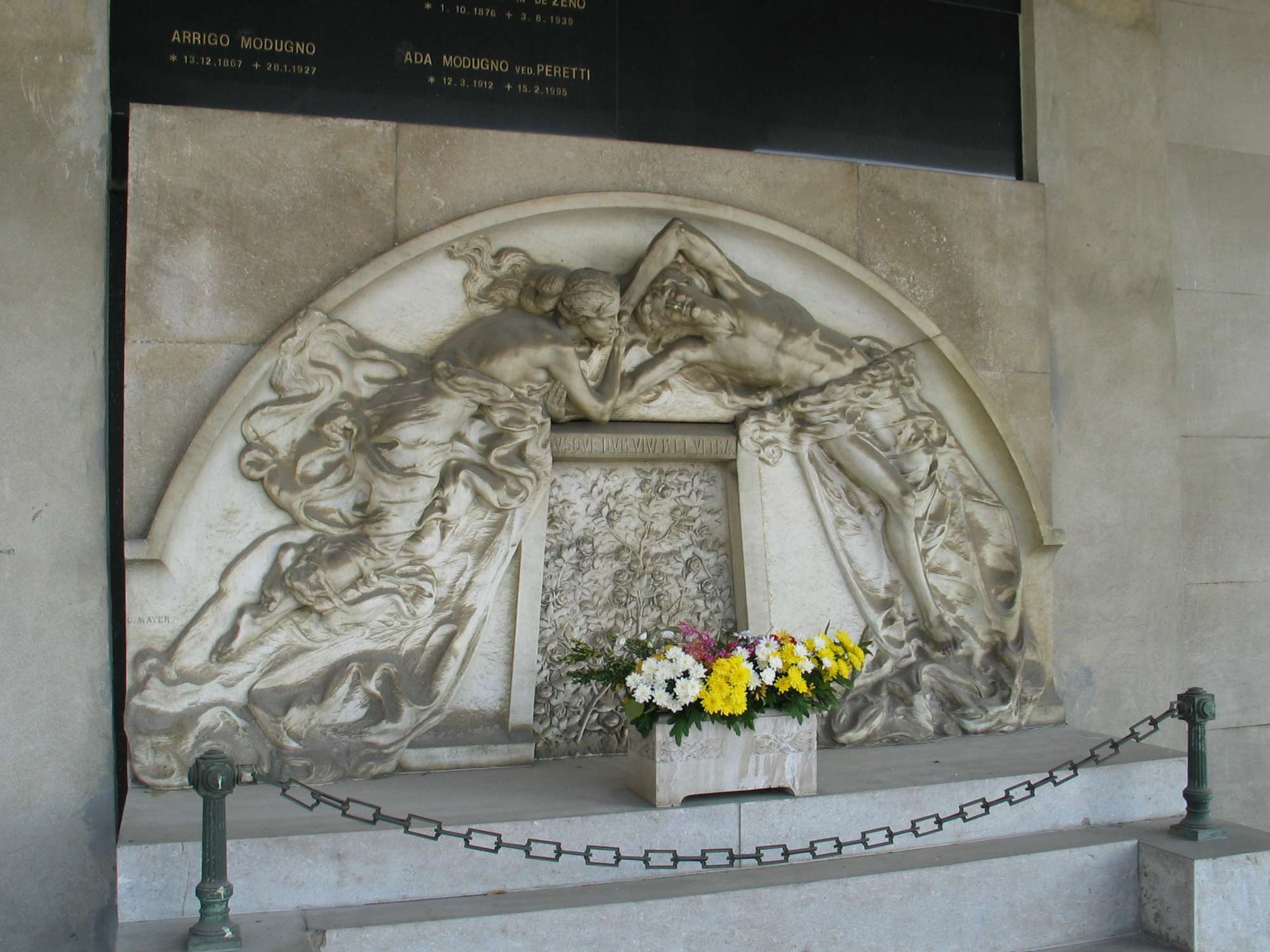 Al di là di tre gradini e di una catena di bronzo è collocata una lunetta marmorea che racchiude una porticina decorata ai lati da rose; entro la lunetta sono scolpite in altorilievo due figure di giovani, un uomo ed una donna, che si congiungono in un abbraccio.