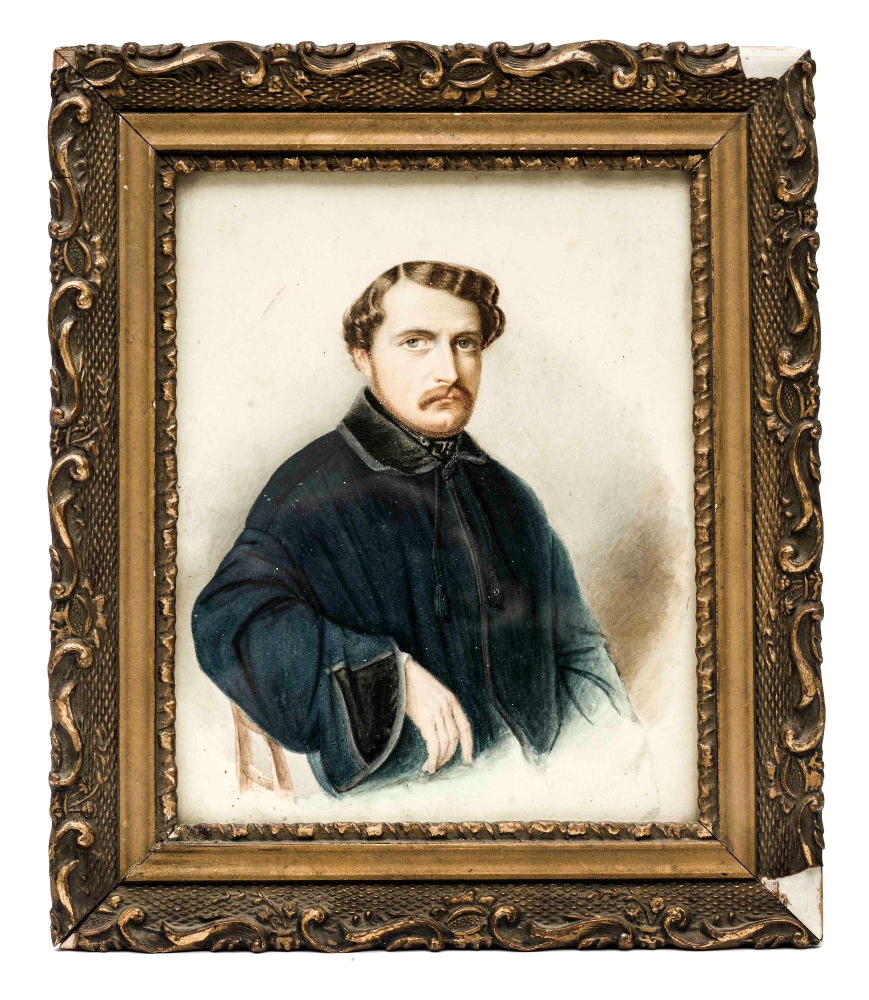 Acquistato nel 1935 da Renato Astolfi, il disegno è un autoritratto del pittore miniaturista e acquarellista Andrea de Castro (Pirano, 1806-Trieste, 1884). Trasferitosi a Trieste con la famiglia, si affermò come miniaturista, insieme al fratello Luigi. Andrea si sposò con la triestina Maria Krall (1811-1887) da cui ebbe tre figlie: Eugenia, Anna ed Emma. Negli anni cinquanta, si avvicinò alla fotografia, svolgendo un apprendistato come pittore ritoccatore presso il fotografo M. Stipanich a Trieste. Nella Guida scematica della città di Trieste (1857), è menzionato quale unico pittore in miniatura della città e, in particolare, attivo in qualità di “pittore, ritrattista, verniciatore e maestro di disegno, via San Nicolò n. 725, al 4 piano, sopra il cancello del Diavoletto” dove lavorerà, anche come fotografo, fino al 1865. Tra gli anni 60 e 70 circa, aprì il Nuovo studio Fotografico del pittore A. de Castro e figlia in via del Giardino a Gorizia e, nel giugno 1865, un atelier a Udine in via dei Gorghi. Alla morte, il 29 novembre 1884, L’Indipendente ne diede notizia definendolo “uno dei più vecchi artisti della nostra città, l’unico forse che coltivava con passione la miniatura”. Nell’opera in esame, egli si presenta seduto, lievemente volto verso destra, con uno sguardo direttamente rivolto allo spettatore e una mano posata sopra lo schienale di una sedia. Non si presenta con gli strumenti del mestiere, ma soltanto vestito di un’umile giacca da lavoro.