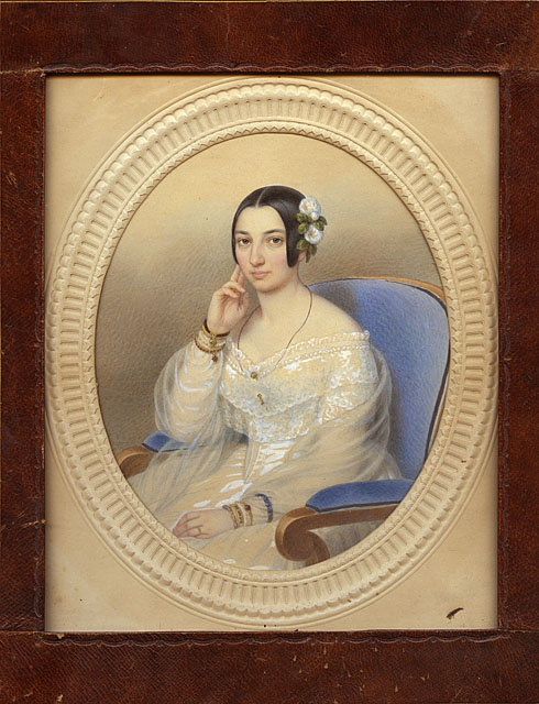 È ritratta Maria Sartorio (Trieste, 1820-Graz, 1892), figlia di Giovani Guglielmo e Carolina Gobbi e maritata nel 1843 con Carlo de Steininger (Vienna, 1804-1867). Sulla biografia dell'effigiata, cfr. Resciniti 2010, pp. 86-87. L’opera è, per la firma, ascrivibile con certezza all'attività dell’austriaco Ignaz Rungaldier (Graz,1799-1876), uno dei ritrattisti più ricercati della società aristocratica del periodo Biedermeier. Formatosi a Graz sotto la guida di Johann Veit Kauperz (1741–1816), si trasferì a Vienna nel 1817 per frequentare l’Accademia, perfezionandosi nell’incisione. Dal 1825 si dedicò alla pittura in miniatura influenzato dall’arte di Carl Josef Alois Agricola (1779–1852) e Johann Nepomuk Ender. Rimase a Vienna fino al 1836 circa e poi ritornò nella sua città natale. Nel ritratto egli colloca la figura in diagonale di tre quarti contro uno sfondo appena accennato, soluzione tipica della ritrattistica ottocentesca. L’abbigliamento e l’acconciatura suggeriscono una datazione attorno agli anni quaranta dell’Ottocento, confermando l’anonima iscrizione a matita, a tergo della cornice, che reca la data 1844.