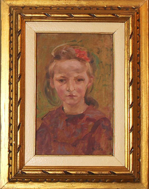 Ritratto di bambina con veste rossa e fiore sui capelli