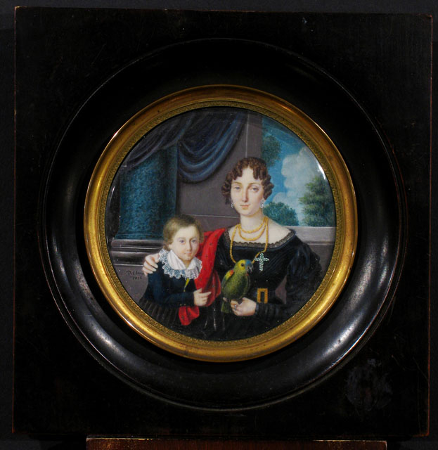 La miniatura è, per la firma, ascrivibile con certezza al pittore romano Luigi Del Bene, che visse a Genova tra il 1813 e il 1825. Il suo stile ricorda in parte quello di Giambattista Gigola; i suoi ritratti si caratterizzano per un “abbondante uso dei mezzi toni ed ombre brune che rendono pallidi i volti” (La collezione di Antonio Ceci 1992, p. 208), per la minuta descrizione dei gioielli e per i tratti somatici dei volti con gli occhi allungati e gli angoli delle labbra sottolineati da ombre. Quanto alla composizione, la miniatura in esame può essere confrontata con quella di collezione privata parigina pubblicata da Schidlof nel 1964 (tav. 162, n. 301), che raffigura una donna con una fanciulla, e con la miniatura raffigurante la marchesa Artemisia Brignole Salve (Vienna, Boris Wilnitsky Fine Arts) per la terrazza tratteggiata sullo sfondo.