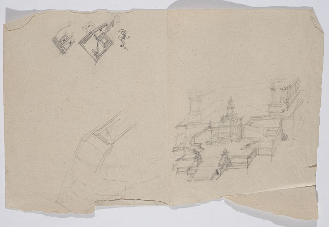 Schizzo del monumento in onore di Vittorio Emanuele II. Sul recto, abbozzo generale del monumento e dettagli architettonici; sul verso, studio per la statua equestre e il suo basamento.