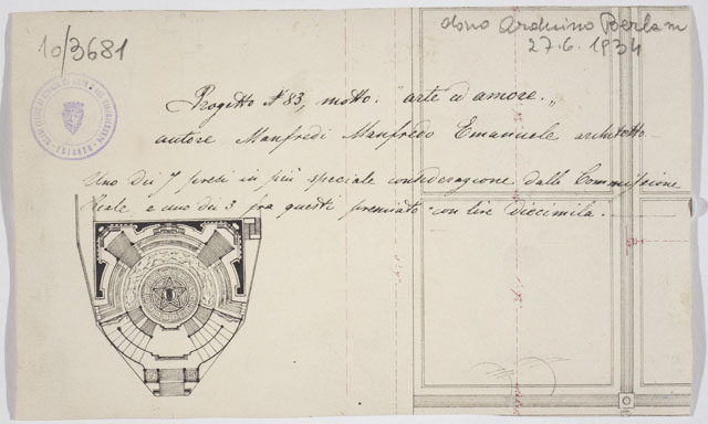 Il disegno è annesso alla serie di studi per il Monumento nazionale a Vittorio Emanuele II, cfr. schede CMSAOAR10_3646-CMSAOAR10_3688, eseguiti da Ruggero Berlam. Egli partecipò al secondo concorso per il monumento a Vittorio Emanuele II a Roma, indetto dal momento che la prima selezione, svoltasi nel 1880, non ebbe un vincitore. Nel primo bando l’unico vincolo posto ai progettisti era stato quello del costo; il secondo, pubblicato il 18 dicembre 1882, prevedeva di collocare il monumento sul colle Capitolino e ne fissava alcune caratteristiche: un fondale architettonico e una statua di Vittorio Emanuele II, dapprima seduto su un trono, poi a cavallo. Secondo Sticotti, Berlam inviò il progetto in incognito da Milano, per non essere riconosciuto come austriaco; ma dopo esser stato esposto a Roma, esso fu fatto sparire, su volontà del primo ministro Agostino Depretis, per non turbare i rapporti che si erano creati con l’Austria. Il concorso, cui parteciparono 98 progettisti, fu vinto da Giuseppe Sacconi, con un progetto che presenta affinità con quello di Ruggero Berlam; secondo classificato Manfredo Manfredi, terzo Bruno Schmitz. In seguito, vi fu un terzo bando ristretto ai primi tre classificati, vinto da Sacconi. Quanto al disegno in esame, si tratta di una copia del progetto N. 83 presentato da Emanuele Manfredo Manfredi e selezionato tra i primi tre dalla Commissione Reale, che lo premiò con diecimila lire.