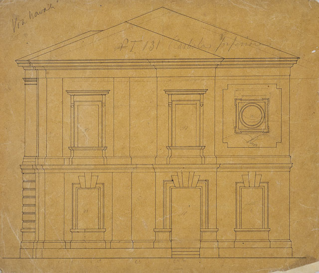 Disegno preparatorio. L'appunto "via Navali" suggerisce si tratti dello studio per un prospetto di uno dei villini realizzati da Ruggero Berlam nella zona di San Vito a Trieste. Confrontando il disegno in esame con il progetto pubblicato da Pozzetto (1999, p. 98, fig. 172), si propone di riconoscervi uno studio per una facciata laterale della casa di campagna eretta su una frazione dell'area Chiarbola inferiore n. 131, corrispondente a via Navali n. 12, per gli eredi di Andrea Ganzoni e di Tommaso Livesey. Presso l'Archivio Generale del Comune di Trieste (Archivio Pianificazione Urbana, ser. disegni 5308/0) si conserva il progetto, completo di prospetto principale, sezione e planimetria, presentato al Magistrato Civico cittadino, che lo approvò nel 1881; data che può esser estesa anche al disegno dei Civici Musei di Storia ed Arte.