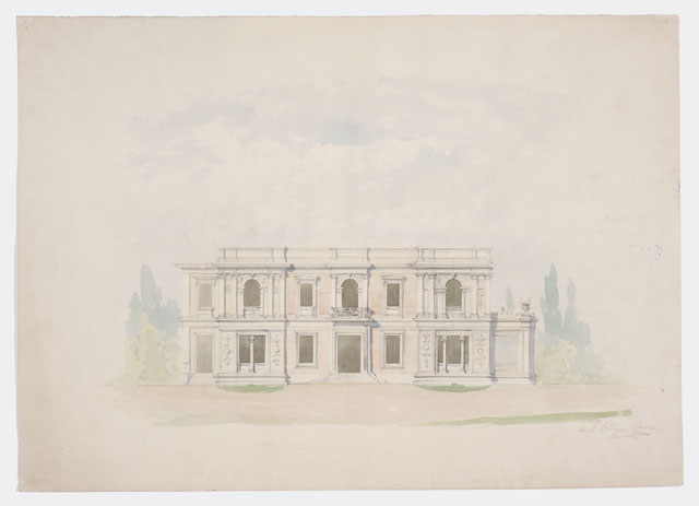 Disegno a matita e acquerello policromo, raffigurante prospetto di villino a due livelli.
