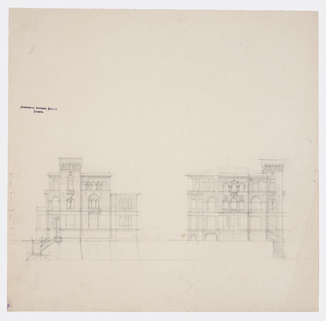 Disegno a matita parzialmente quotato raffigurante prospetti laterali per un villino a tre livelli con torretta. Il tratteggio parallelo a matita indica un paramento murario in cotto.