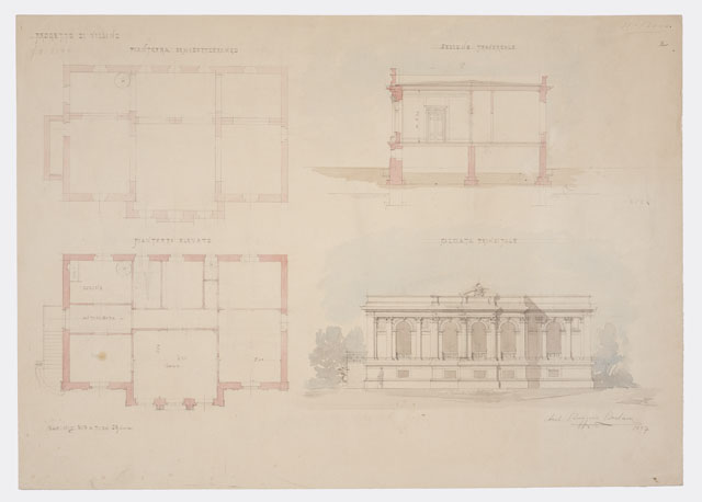 Tavola a matita e acquerello policromo, raffigurante un progetto per un villino a due livelli (piano semisotterraneo e piano elevato). Essa contiene le planimetrie dei due piani (in qualche locale è indicata con scritte la destinazione d'uso), la sezione trasversale e il prospetto della facciata principale.