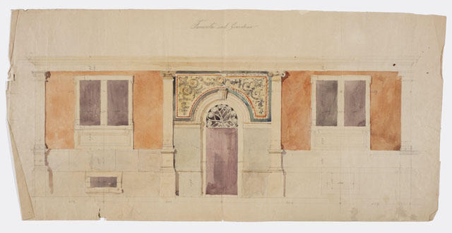 Si tratta di un progetto per il livello inferiore di una facciata su giardino con decorazione policroma a girali da immaginarsi eseguita ad affresco.