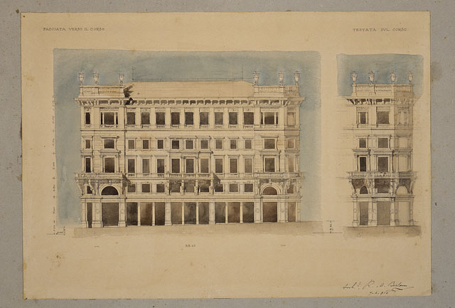 Disegno a matita, penna e acquerello, parzialmente quotato, raffigurante il prospetto della facciata verso il Corso e il dettaglio della testata verso il Corso.