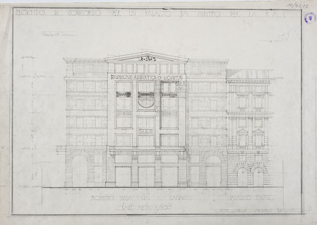 Il disegno in esame appartiene alla serie "Progetto di concorso per un palazzo di affitto per la Riunione Adriatica di Sicurtà, da costruirsi a Trieste in Piazza Oberdan", cfr. schede CMSAOAR10_4207-CMSAOAR10_4218, eseguito da Arduino Berlam. Il 3 febbraio 1934 Arnoldo Frigessi di Rattalma, presidente della Riunione Adriatica di Sicurtà, acquistò l’ultimo lotto disponibile nell’area di piazza Oberdan (pari a 1165 mq) per edificare un palazzo ad uso uffici e abitazioni di alto livello, con l’obbligo di rispettare i vincoli indicati nel piano di sistemazione dell’esedra Oberdan del 1925, per quanto riguardava le facciate e i portici. Lo stesso anno venne indetto un concorso ristretto, cui parteciparono Arduino Berlam, Gustavo Pulitzer-Finali e Umberto Nordio, che risultò vincitore (cfr. Krasovec in Nicoloso, Rovello 2005, pp. 177-179, n. 19).