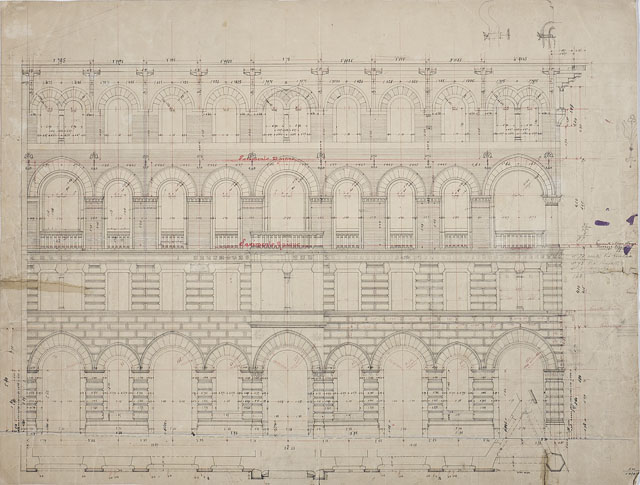 Il disegno è da riferirsi alla progettazione di Casa Leitenburg, cfr. CMSAOAR10_4226-CMSAOAR10_4232. Progettato nel 1887 da Ruggero Berlam per Edoardo de Leitenburg, l’edificio è considerato un capolavoro dell’architetto triestino, formatosi a Brera con Camillo Boito, oltre che un manifesto politico. Si tratta di un edificio di gusto neotuscanico, che divenne modello per innumerevoli edifici abitativi triestini, costruiti fino al 1940, quale esempio di autentica "architettura italiana". L’adozione, infatti, del neo-fiorentino fu “apprezzata da alcuni eminenti triestini che ne valutarono la componente ideologica intesa quale rifiuto dello "stile austriaco" a favore di un’elaborazione autenticamente italiana” (Lorber 2007, p. 80 con bibl. prec). Si tratta di un edificio equilibrato nel disegno in cui si accoppiano o isolano finestre architravate nel primo piano e a pieno centro nel secondo e terzo, ove sono rimarcate, di contro allo sfondo del cotto, da estradossi quasi archiacuti bicromi. Nel disegno in esame, che illustra la facciata prospiciente via Giulia, l’elaborazione del progetto perviene a un “sorprendente equilibrio tra peso e leggerezza" (Lettis in Rovello 2007, p. 181): lo spigolo del piano terra, come quello del secondo, sono aperti e si contrappongono ai pieni del secondo e quarto piano.