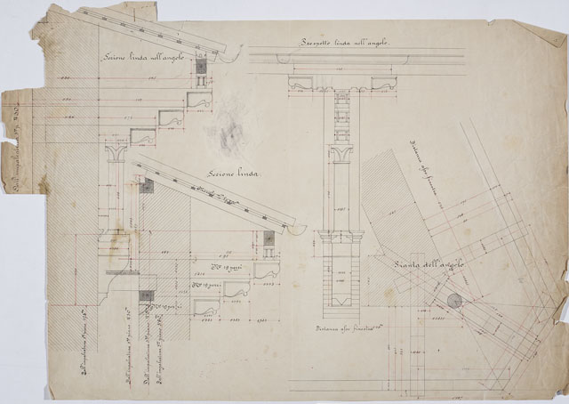 Il foglio contiene quattro disegni quotati raffiguranti: 1) sezione linda nell'angolo; 2) sezione linda; 3) prospetto linda nell'angolo; 4) pianta dell'angolo. Sono registrate anche le distanze dall'impalcatura, la distanza dall'asse delle finestre, il morale dell'orditura del tetto e il numero di pezzi di cui sono composti gli elementi descritti.