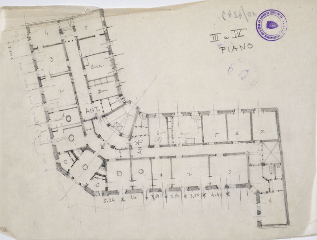 Disegno a matita raffigurante la planimetria del III e IV piano di un edificio per l'Istituto Nazionale d'Assicurazione per gli Infortuni sul Lavoro. Studio della distribuzione dell'edificio con definizione della destinazione d'uso (scritte all'interno dei locali).