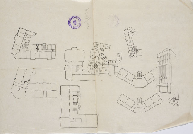 Disegno a matita su carta; contiene otto schizzi per planimetrie di un palazzo, uno per un ingresso e uno schizzo del prospetto. Una planimetria presenta scritte che indicano la destinazione d'uso degli ambienti.
