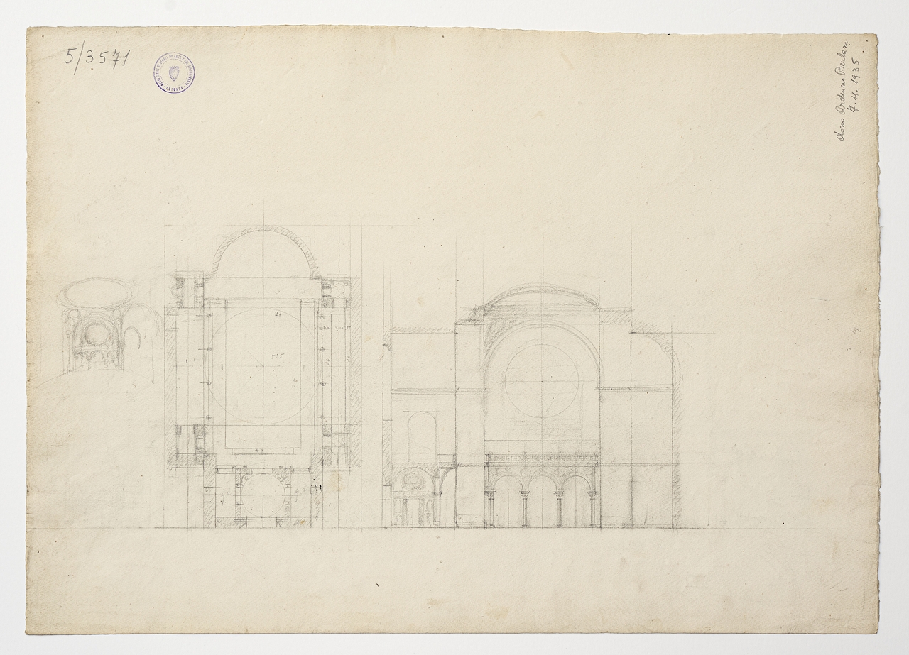Tavola progettuale per la Sinagoga di Trieste, raffigurante la facciata principale e quella laterale.