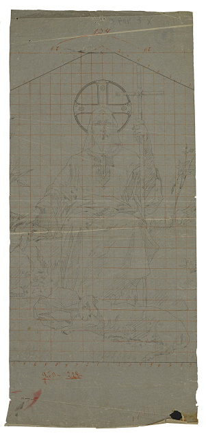 Disegno a penna, quadrettato, raffigurante il bozzetto parziale per un affresco con Il Buon Pastore.