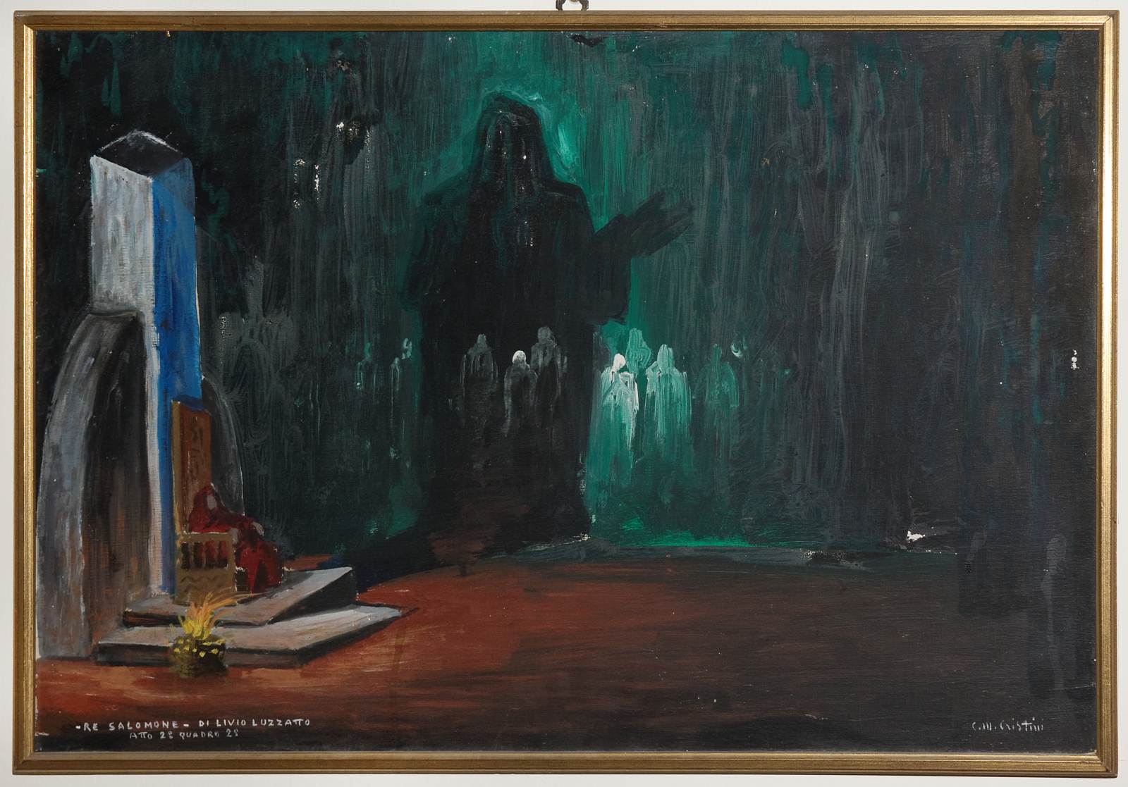 Re Salomone di Livio Luzzatto, Atto 2., quadro 2., Sulla sinistra trono ieratico con sopra figura vestita di mantello rosso . Sul fondale ombra di figura incappucciata e molte sagome di persone di schiena appena abbozzate come fantasmi