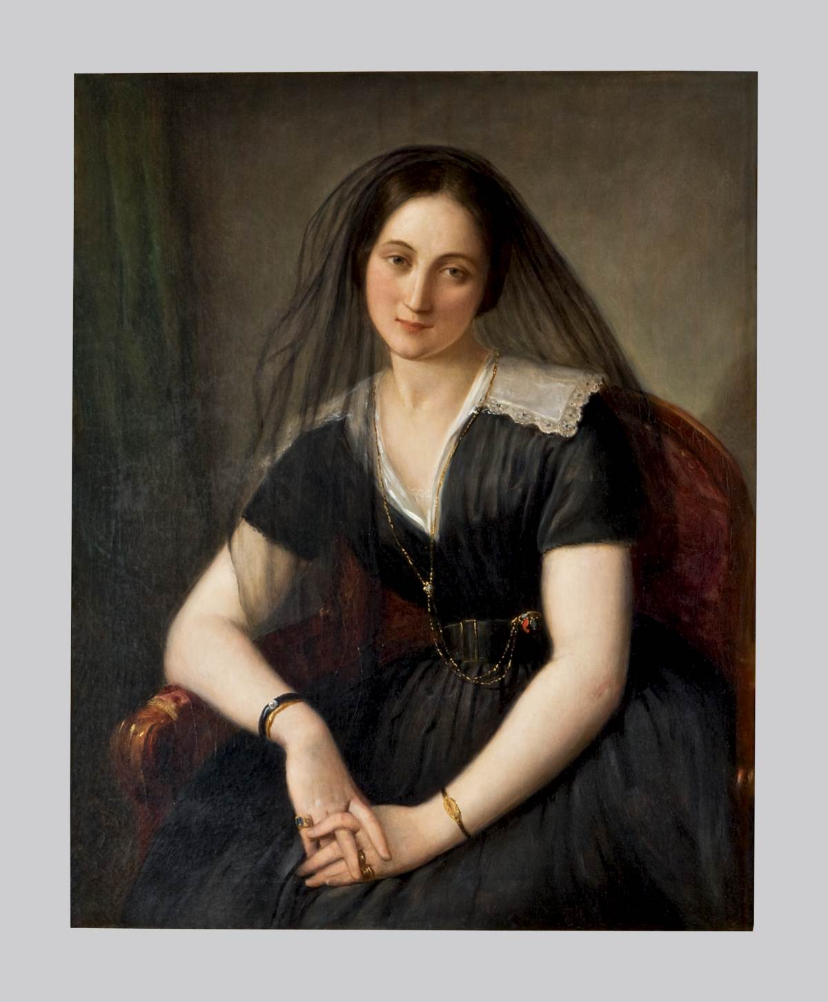 Ritratto di Adelaide RIstori, qui ritratta in giovane età con un velo nero che le copre la testa arrivando fino al busto. Una cintura con grossa fibbia sistemata sull'abito ne evidenzia il punto vita. A sottolineare la scollatura del vestito una catenina d'oro e pietre colorate, con saliscendi, alla quale è legata probabilmente un paio di occhialini. La donna indossa numerosi altri gioielli: tre bracciali e vari anelli d'oro, forse per rimarcare il nuovo status sociale acquisito. La posa acquisita dall'attrice in questo ritratto è in parte malinconico e al tempo stesso languido.