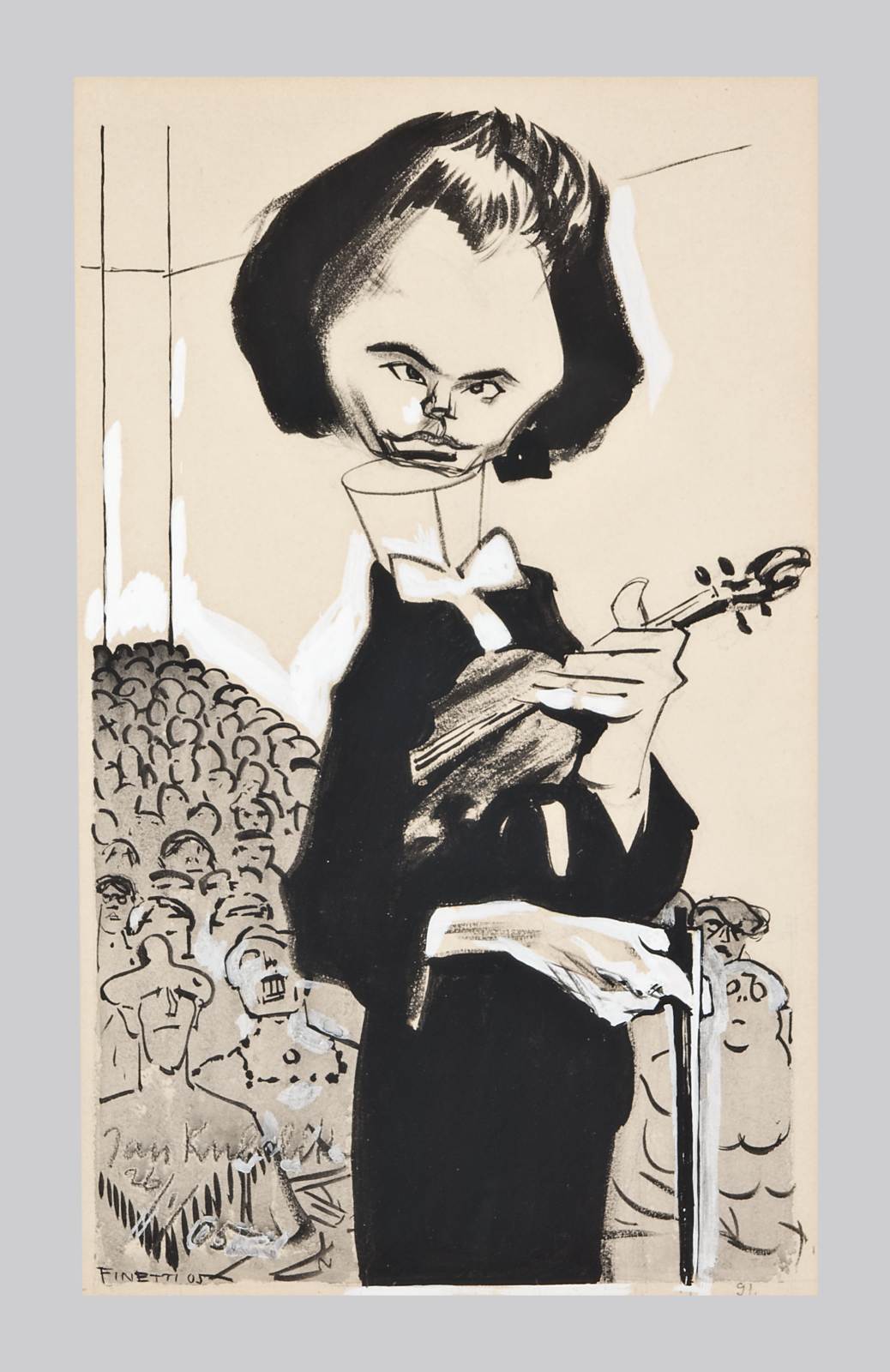 Il celebre violinista è qui ritratto in modo caricaturale. Indossa un elegante abito nero dal rigido ed alto colletto bianco. Alle sue spalle una nutrita folla di persone, rese in modo sommario e grottesco, aspettano di sentire la musica provenire dal violino che tiene stretto tra le mani