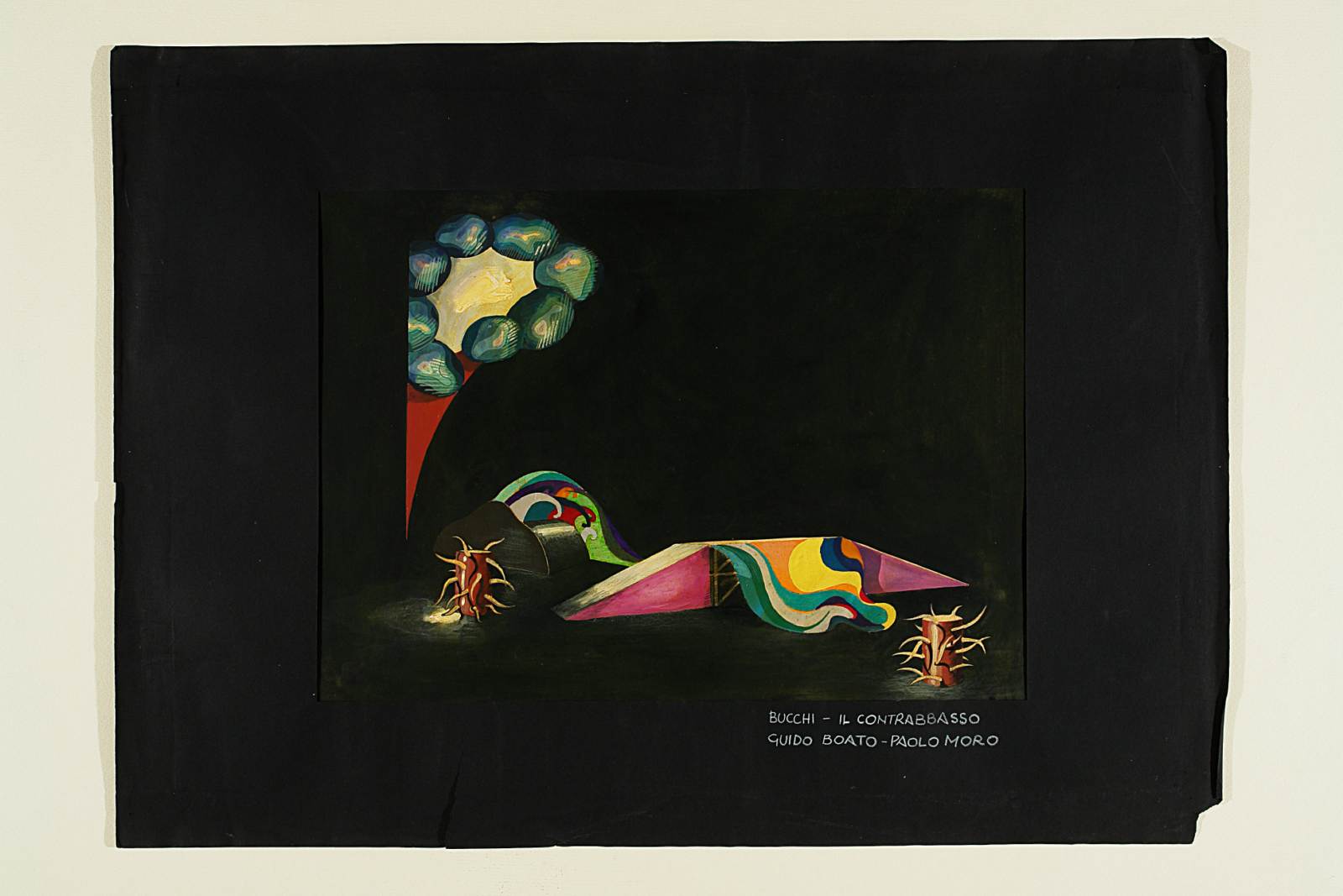 Scenografia per Il contrabbasso, Grottesco in un atto e tre scene di Mario Mattolini e Mauro Pezzati, da Il romanzo del contrabbasso di Anton Cechov; musica di Valentino Bucchi (1916-1976). Prima rappresentazione: Firenze, Teatro della Pergola, 20 maggio 1954
