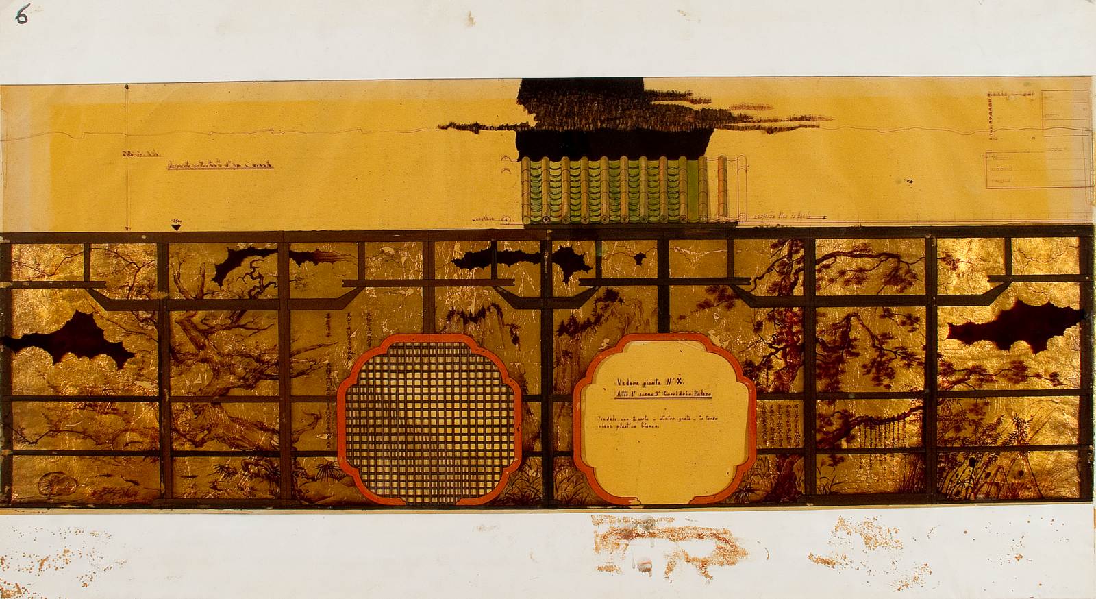 Cin-Ci-Là, operetta di Virgilio Ranzato, atto 1., scena 3. Interno con corridoio e parete di pannelli mobili con riquadri che lascia vedere il giardino sullo sfondo