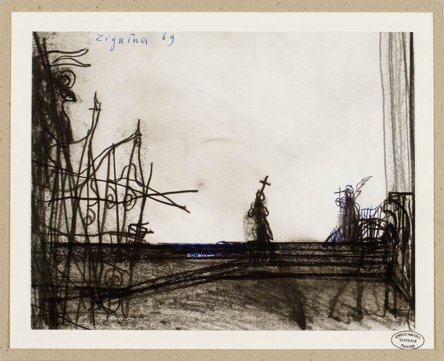 Bozzetto scenografico per Il convitato di pietra, opera di Aleksandr Sergeevič Dargomyžskij, prima rappresentazione 6 marzo 1969, nuova per Trieste, Teatro Comunale Giuseppe Verdi Trieste, regia di Carlo Piccinato