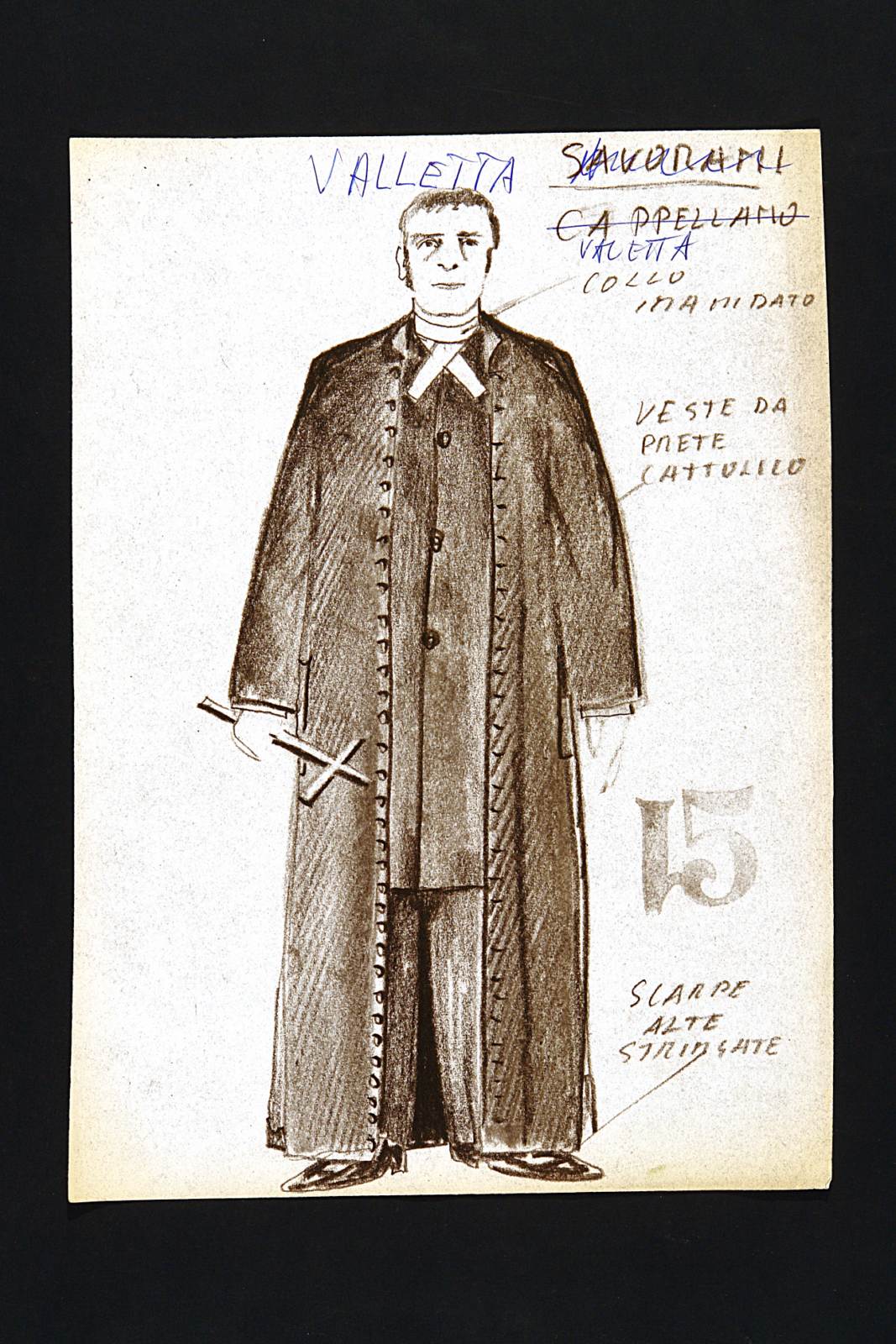 Figurino per Motivo di scandalo e riflessione di John Osborne, traduzione di Paola Ojetti, novità per l'Italia in edizione integrale; regia di Raffaele Maiello. Trieste, Auditorium, 19.01.1996-13.02.1996