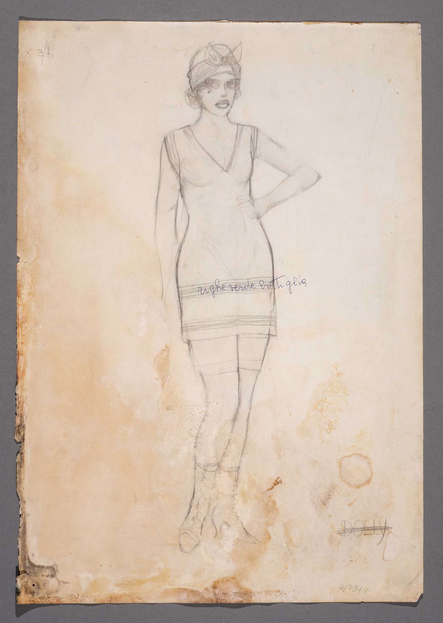 L'opera da tre soldi, di Bertolt Brecht e Kurt Weill, regia di Giorgio Strehler. Figurino di figura femminile in biancheria intima, corta sottoveste scollata a V e corti mutandoni, capo coperto da turbante con fiocco e stivaletti stringati