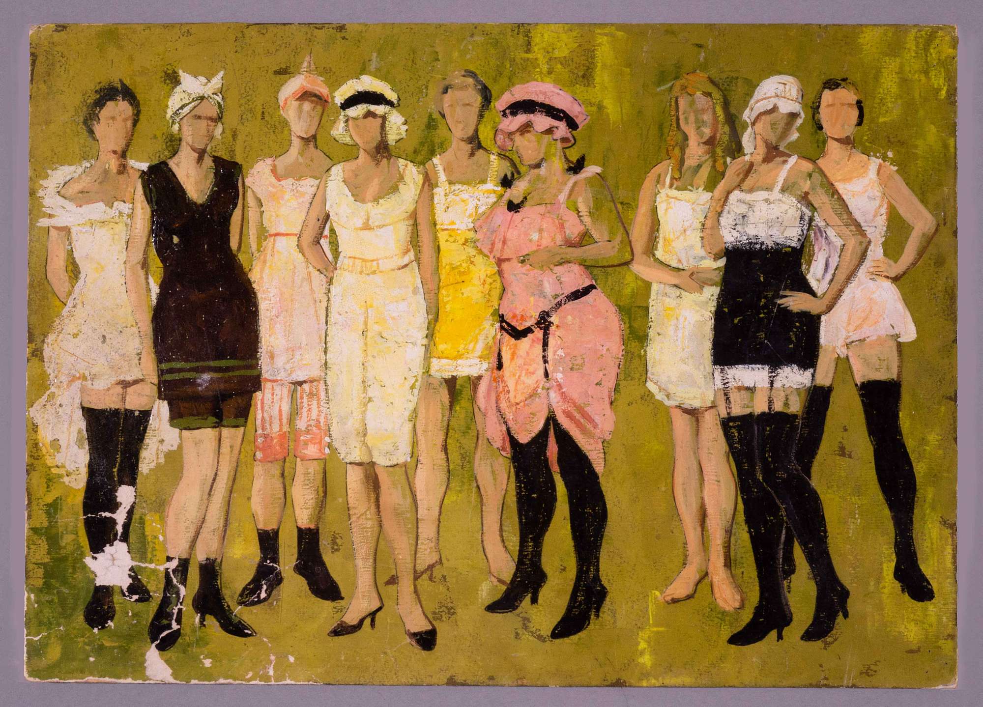 L'opera da tre soldi, di Bertolt Brecht e Kurt Weill, regia di Giorgio Strehler. Figurino di gruppo di nove figure femminili in biancheria intima di svariate fattezze, su toni del nero, bianco, rosa e giallo, sfondo verde oliva.