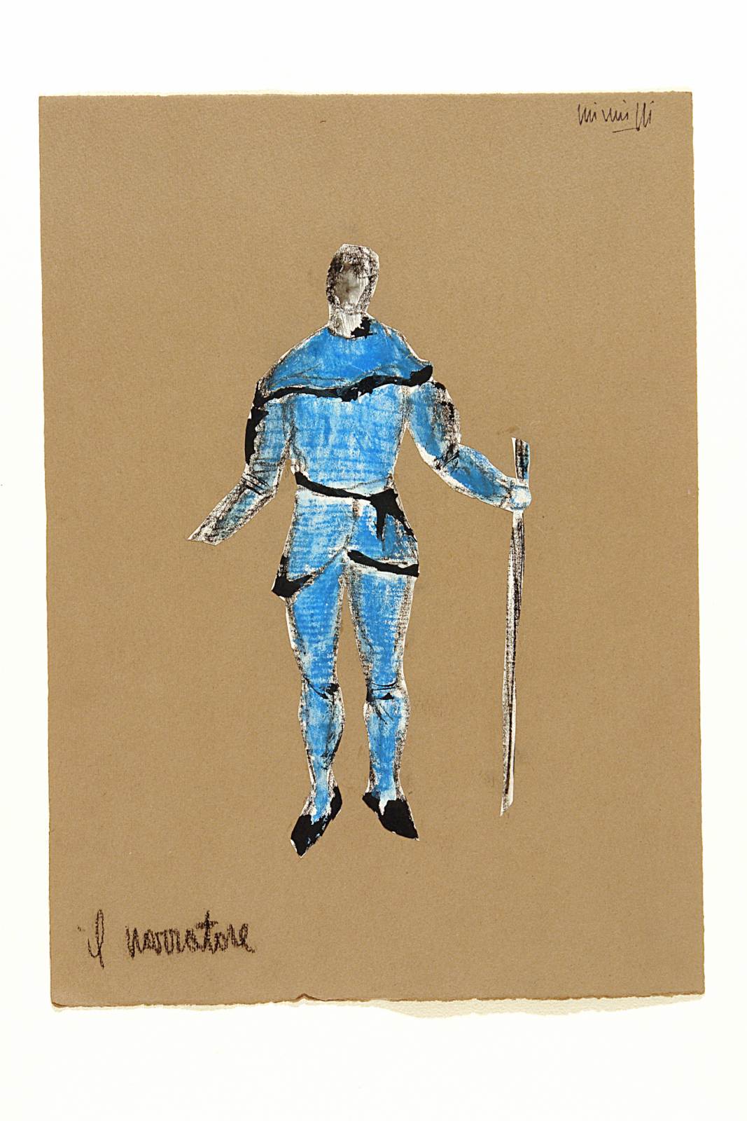 L'anno della peste, sacra rappresentazione su testi medievali raccolti da Sergio Miniussi. Il narratore, figura maschile intera vestita di azzurro, sorregge un bastone con la mano sinistra