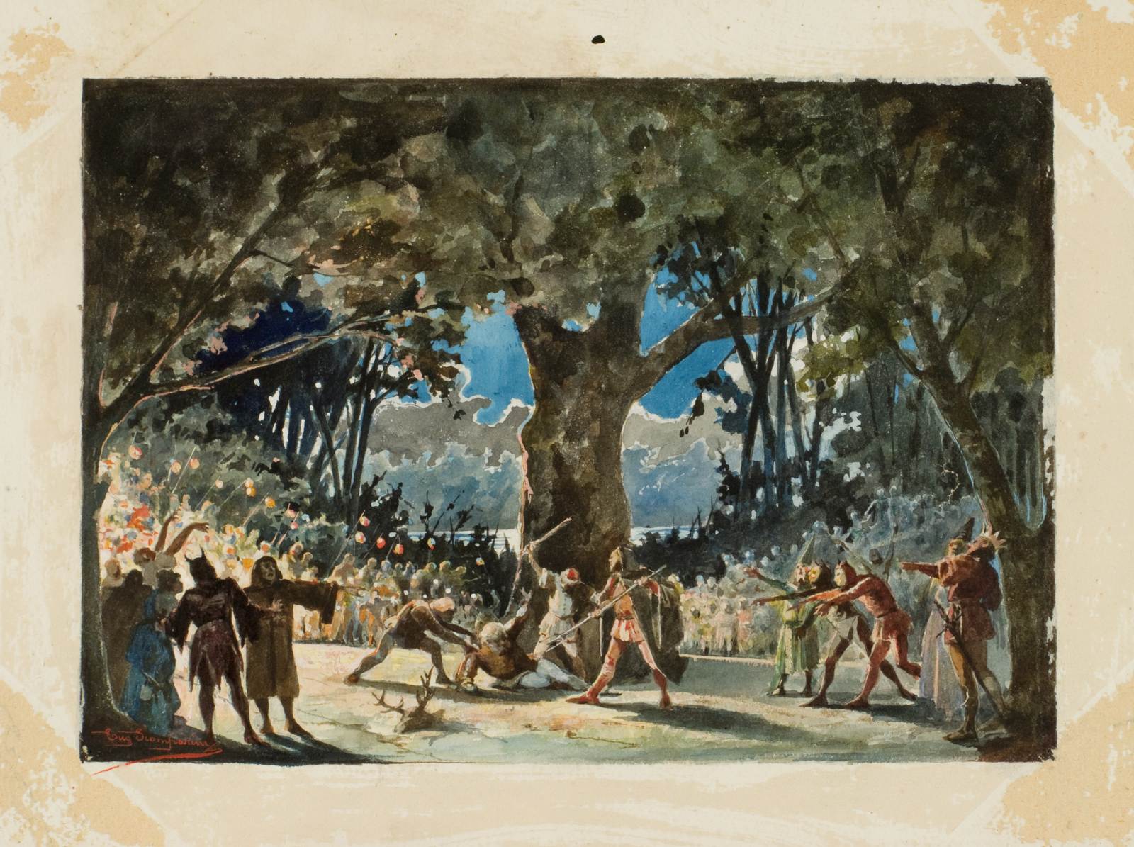 Falstaff, opera di Giuseppe Verdi, ultimo atto, nella foresta Falstaff viene bastonato e deriso dalla folla circostante