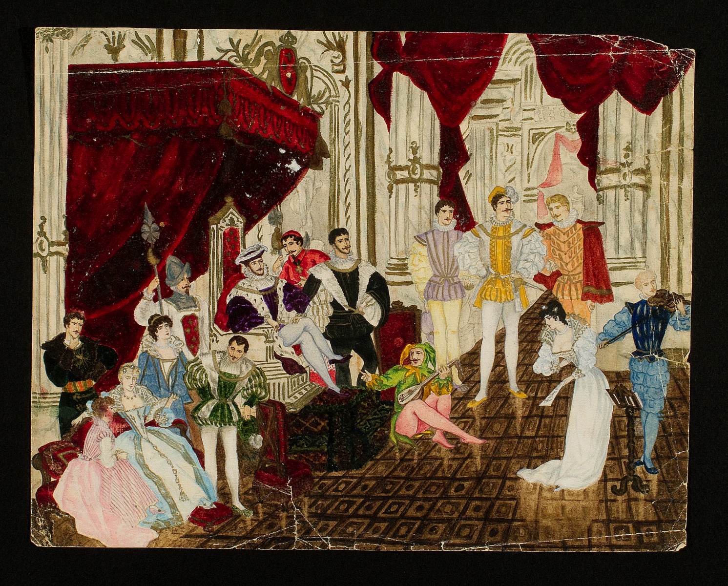 Rigoletto, opera di Giuseppe Verdi, interno con figure in costume