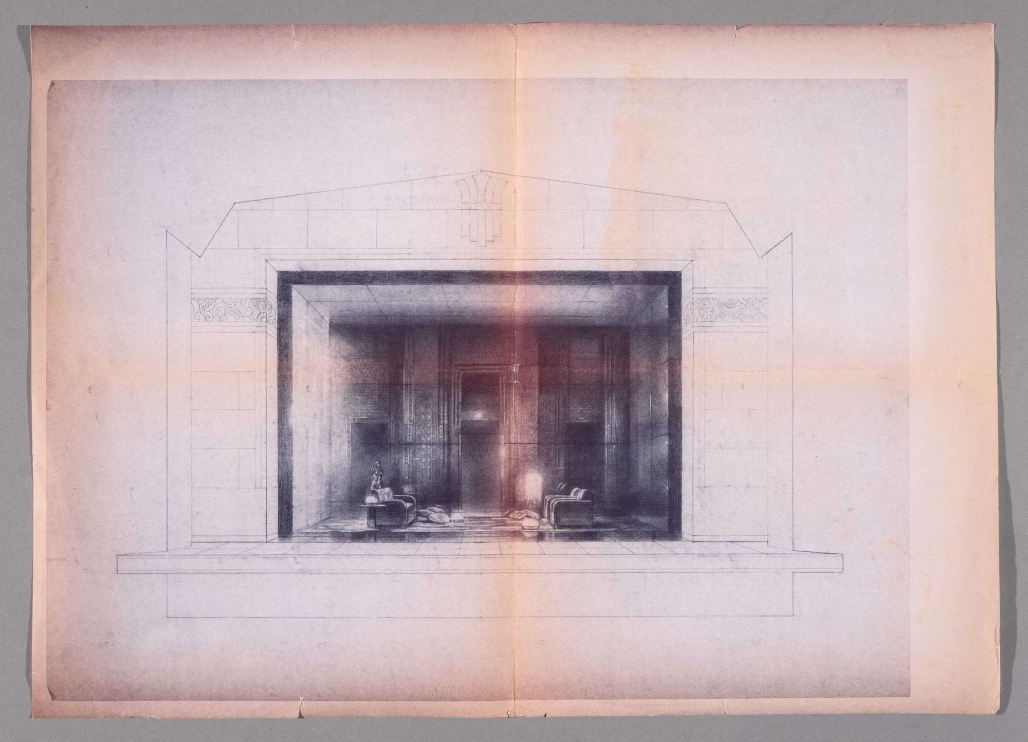 Come tu mi vuoi, dramma di Luigi Pirandello, atto 1. Interno con salotto elegante, divani, cuscini, tavolo, lampade e scultura. Tre porte si aprono sullo sfondo. L'ambiente è contornato da una cornice massiccia