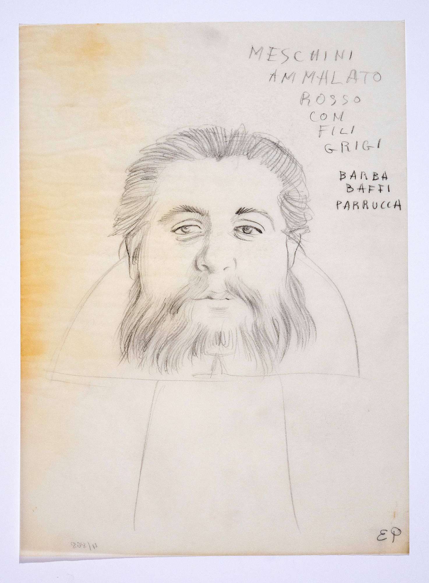 Il gioco dei potenti, libero adattamento di Giorgio Strehler da Enrico VI, dramma storico di William Shakespeare, in 15 atti e 2 giornate. Ritratto di testa maschile di fronte con capo scoperto, barba e baffi.